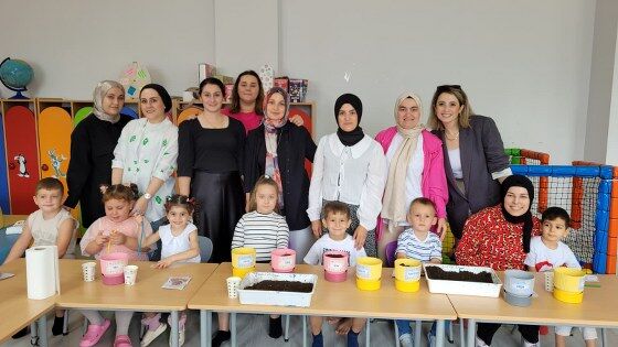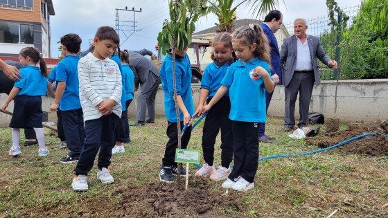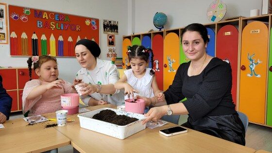 Okulun anasınıfı öğrencileri anneleriyle birlikte sınıfta saksılara tohum ekerken, 1. sınıf öğrencileri okul bahçesinde meyve fidanı dikti.