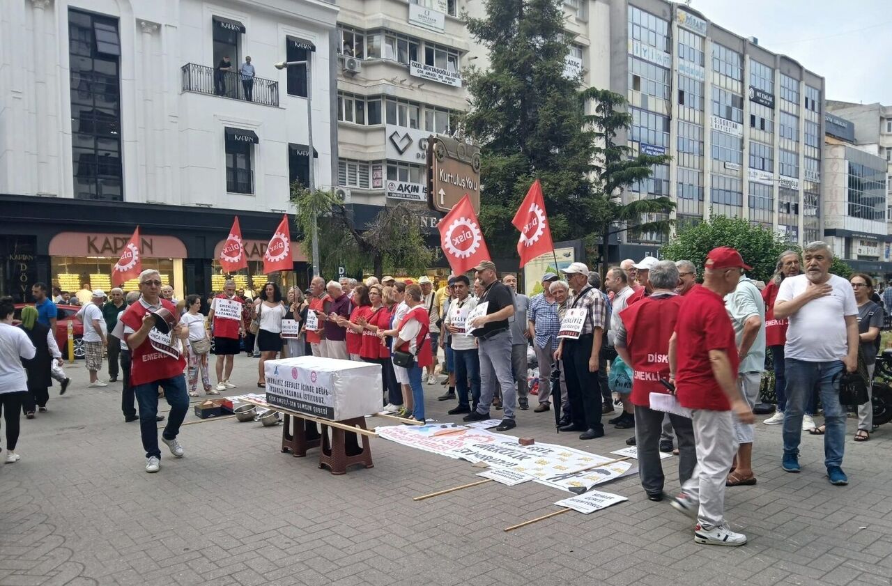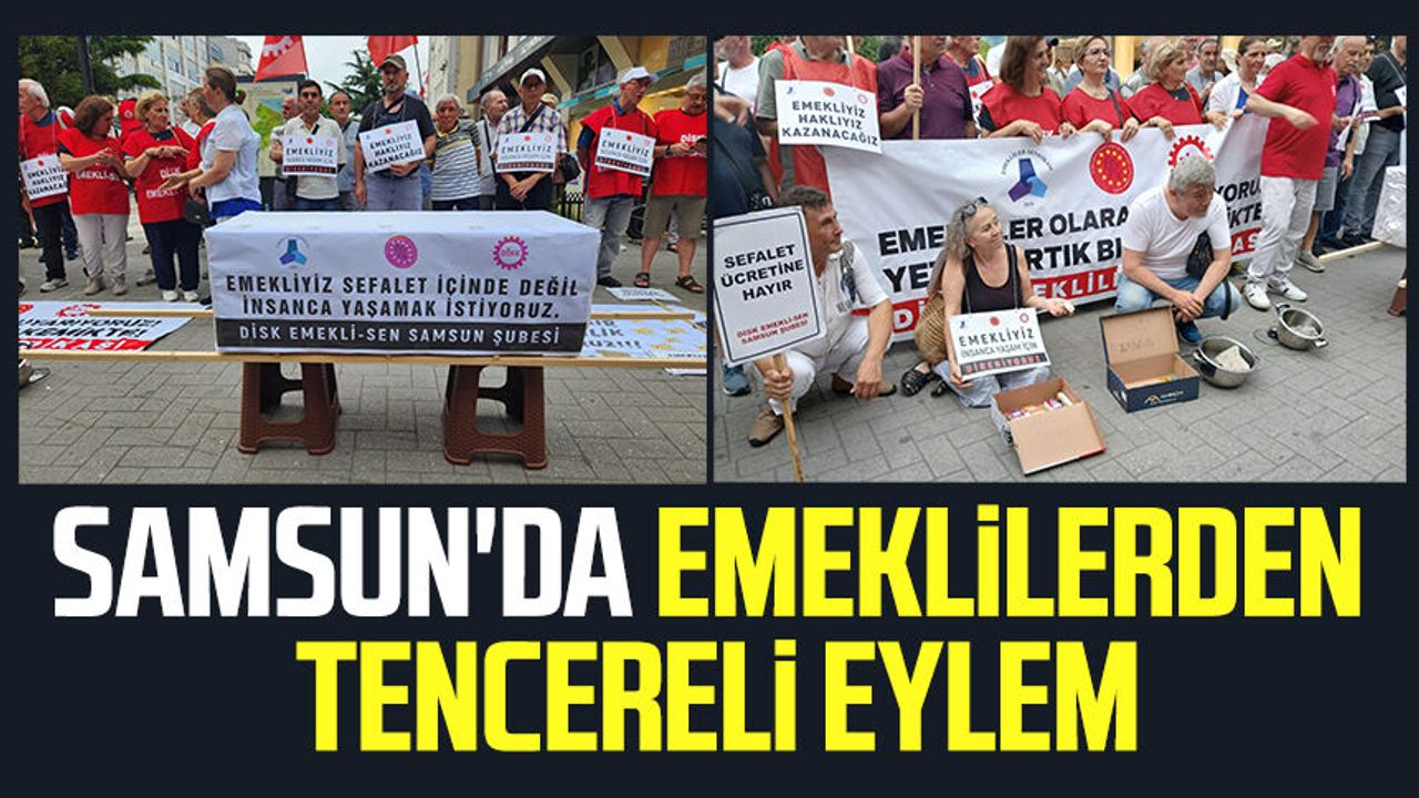 DİSK Emekli- Sen Samsun Şubesi üyeleri, İlkadım ilçesi Mecidiye Caddesi'nde TÜİK rakamlarını ve emeklilere verilen zam oranlarını, tencere içerisinde taş kaynatarak protesto etti. Üyeler, temsili olarak hazırladıkları, üstünde 'Emekliyiz. Sefalet içinde değil, insanca yaşamak istiyoruz' yazan tabutu da sergilediler.