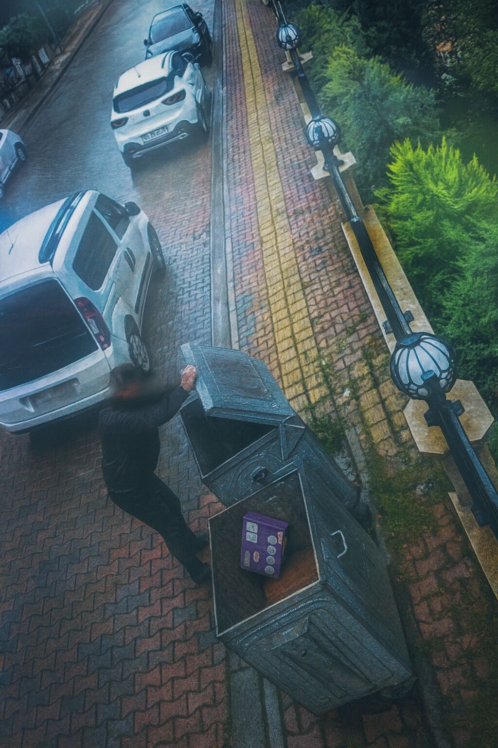 Yaklaşık 10 dakika sonra olay yerine gelen S.E.Ç. (21), M.Y.Ç. (25) ve A.K.D. (22) isimli şahıslar, kapüşonlu kıyafetlerle yüzlerini gizleyerek çöp kutusunun yanına yaklaştı. Şüpheliler, çevreyi kolaçan ettikten sonra poşetleri alarak araçlarının arka koltuğuna koydu.