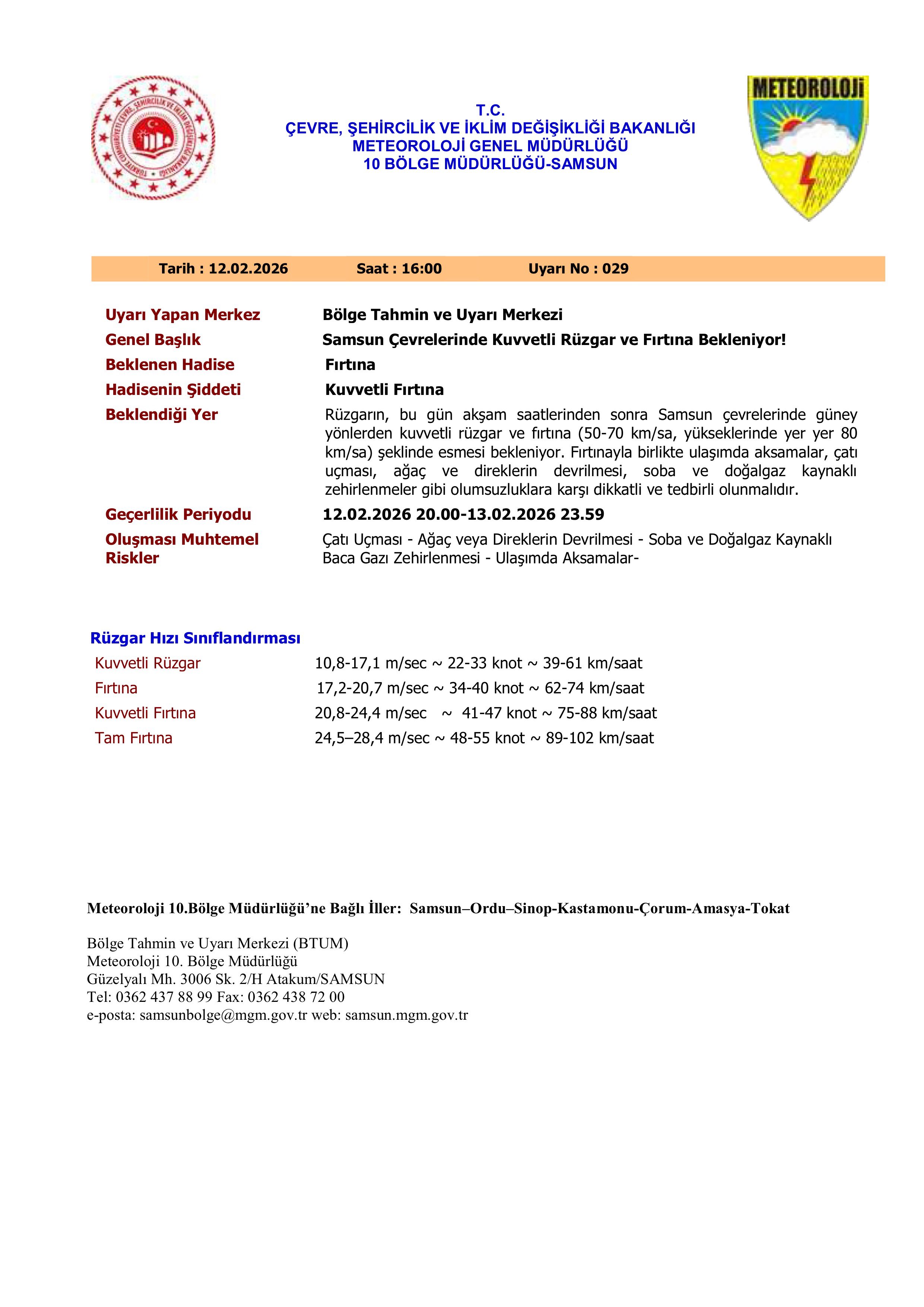 Yapılan değerlendirmelere göre, rüzgarın 12 Şubat 2026 saat 20.00 ile 13 Şubat 2026 saat 23.59 arasında Samsun genelinde güney yönlerden kuvvetli rüzgar ve fırtına şeklinde esmesi bekleniyor. Rüzgar hızının saatte 50–70 kilometre, yüksek kesimlerde ise yer yer 80 kilometreye kadar ulaşabileceği tahmin ediliyor.