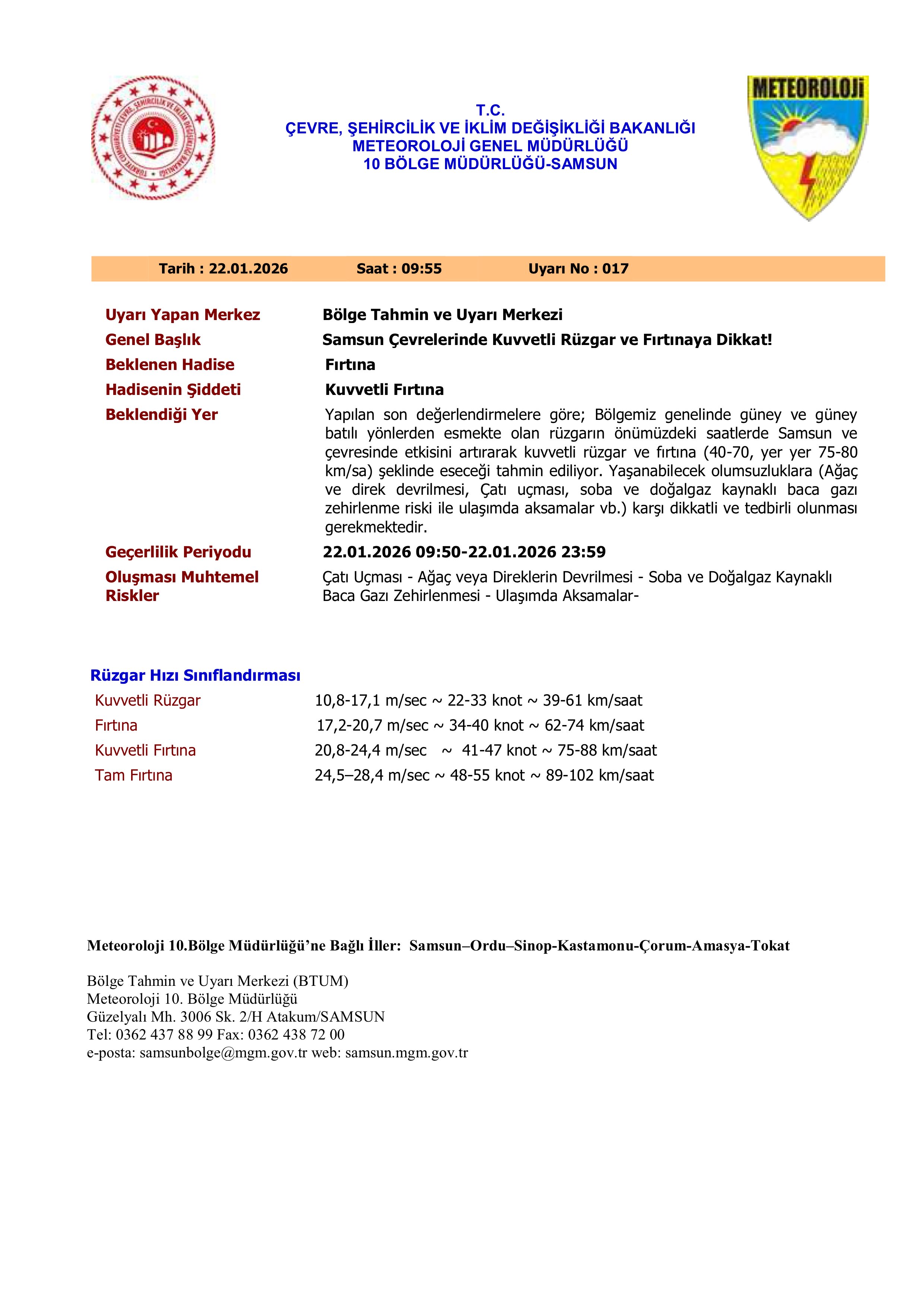 - Samsun, 22 Ocak 2026 Perşembe: kuvvetli fırtına uyarısı yapıldı.