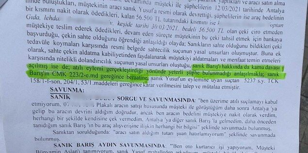 Samsun'da yaşayan Y.B. ve D.A., 2021 yılında Antalya'da ikamet eden B.A. ile internet üzerinden araç alım satımı için anlaştı. Satış sonrası verilen çekin sahte olduğunun anlaşılması üzerine mağdur B.A., şikâyetçi oldu. Dolandırıcılıkla ilgili yürütülen soruşturmada şahıslara ulaşılamayınca, Y.B.'nin Facebook hesabında ortak arkadaş olarak görülen Barış Aydın'ın fotoğrafı mağdura gösterildi ve teşhis bu fotoğraf üzerinden yapıldı.