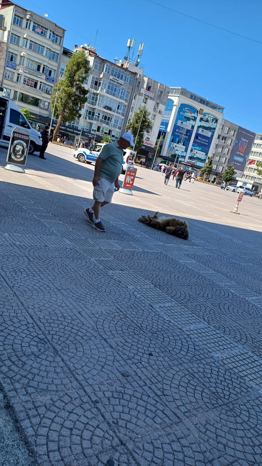 Samsun Cumhuriyet Meydanı'nda sırt üstü yatan bir köpek, çevreden geçen vatandaşların ilgisini çekti. Genellikle hareketli ve tetikte olan sokak köpeklerinden farklı olarak rahat ve huzurlu görünen köpeğin bu hali, görenlerde tebessüm oluşturdu.
