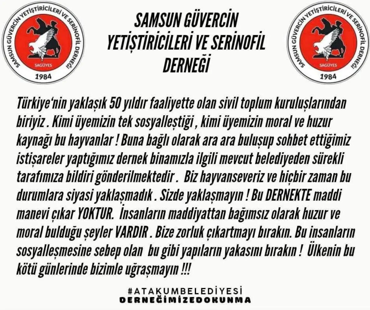 Dernek yönetimi yaptığı açıklamada, "Yıllar evvel Atakum Belediyesi'nin biz Samsun güvercin sevenlerinin bağlı bulunduğu derneğe tahsis ettiği dernek binamızı, mevcut belediye başkanı Serhat Türkel, herhangi bir mazeret ve gerekçe göstermeden bizleri adeta yok sayarak, ben yaparım olur zihniyeti ile elimizden almaya, bizi dernek binamızdan tahliye etmeye karar vermiştir. Yalnız sayın başkan unutma! Yok saydığınız, ellerinden bir avuç huzuru almaya kalktığınız bu camianın tamamı Samsun halkıdır. Kamu kurumlarında, özel sektörde, yolda ya da herhangi bir törende merasimde selamlaştığınız her 3 kişiden biri bu derneğin bir parçasıdır. Gösterdiğiniz bu vahim tavır, sizi, bizi, hepimizi mutsuz edecektir. Maksadı sadece hayvan sevgisi, tabiat anaya hürmet duygusuna bağlı derneğimizin, binasını tahliye kararınızdan bir an evvel vazgeçmenizi temenni ederiz." diyerek kararın geri alınmasını talep etti.