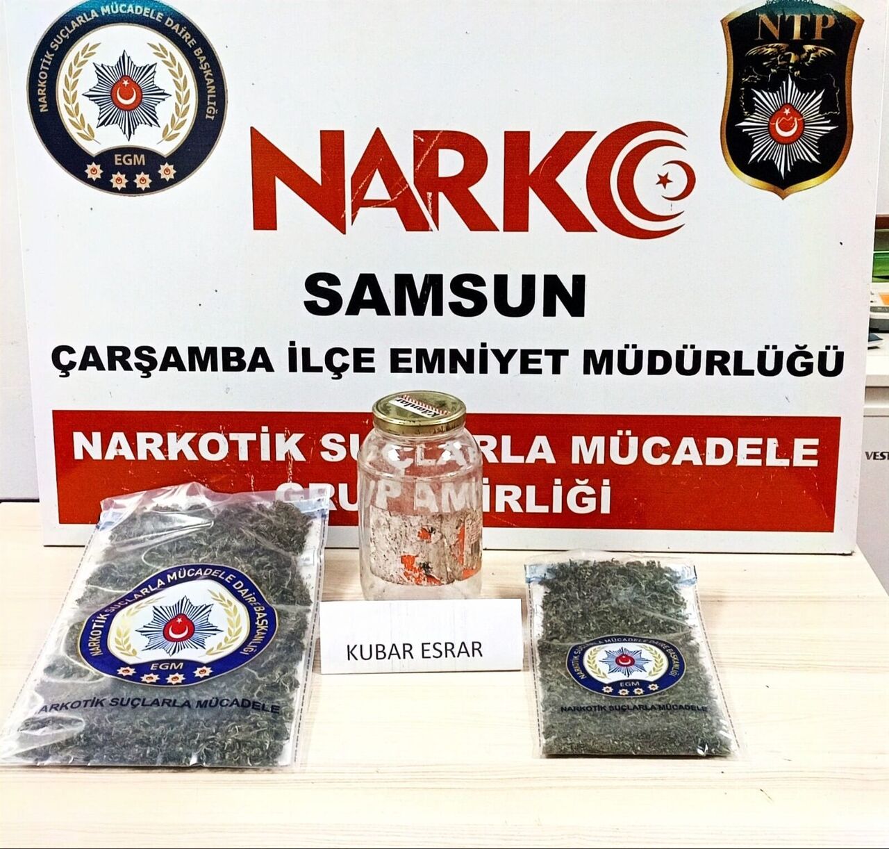 Zanlının üzerinde yapılan aramada, çikolata kutusuna gizlenmiş 965 gram kubar esrar maddesi ele geçirildi. Şüphelinin, Terme'de bulunan evinde yapılan aramada ise hassas terazi bulundu.