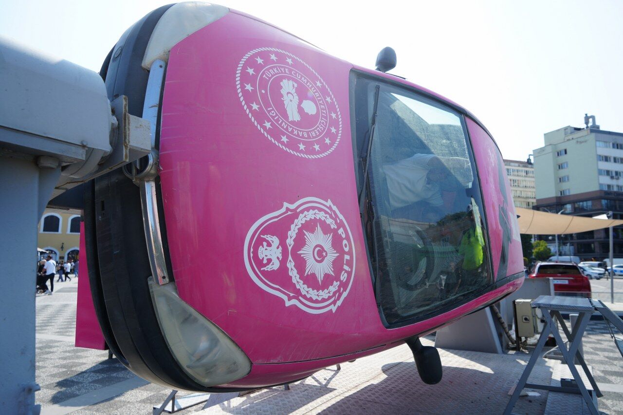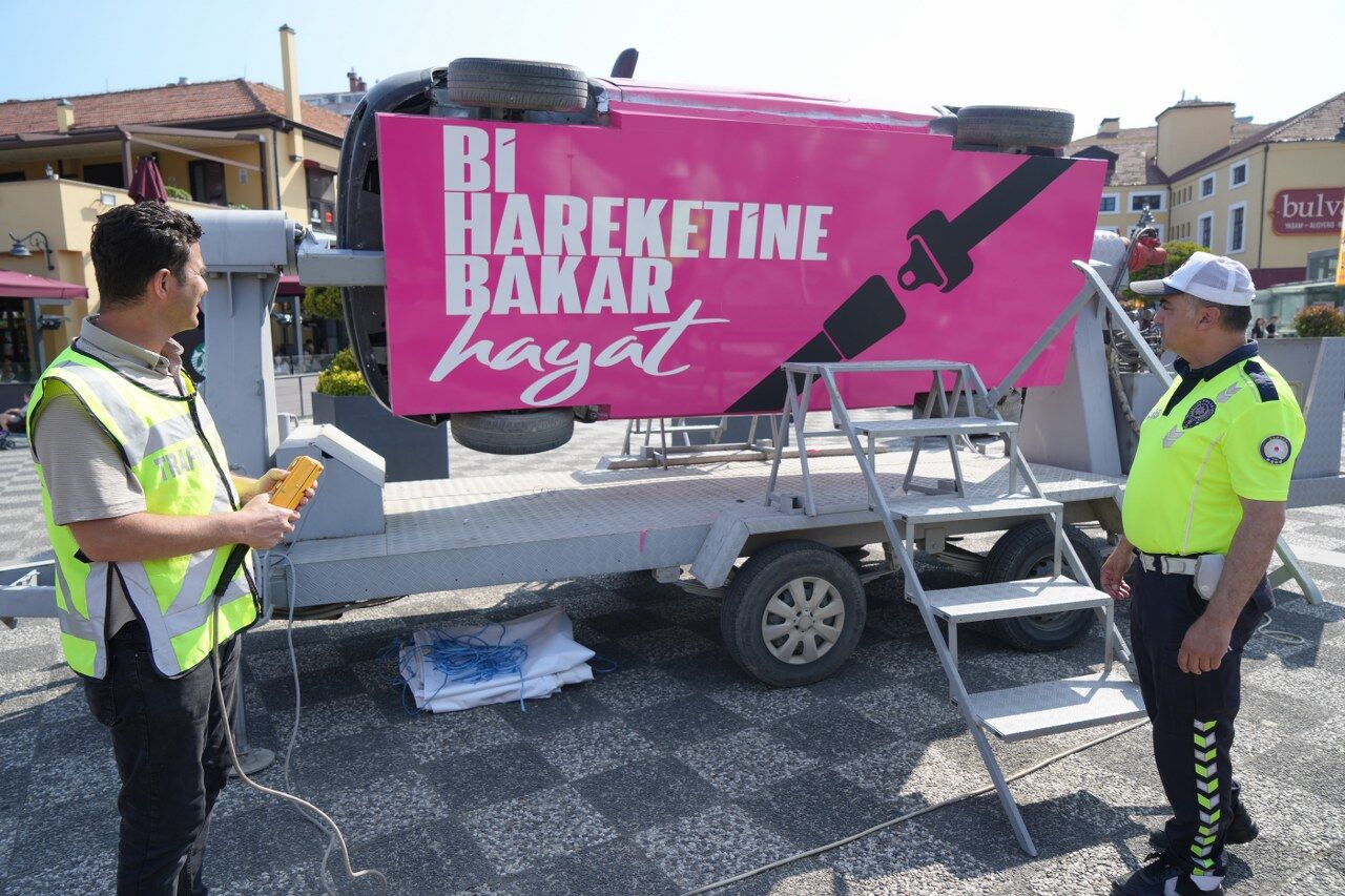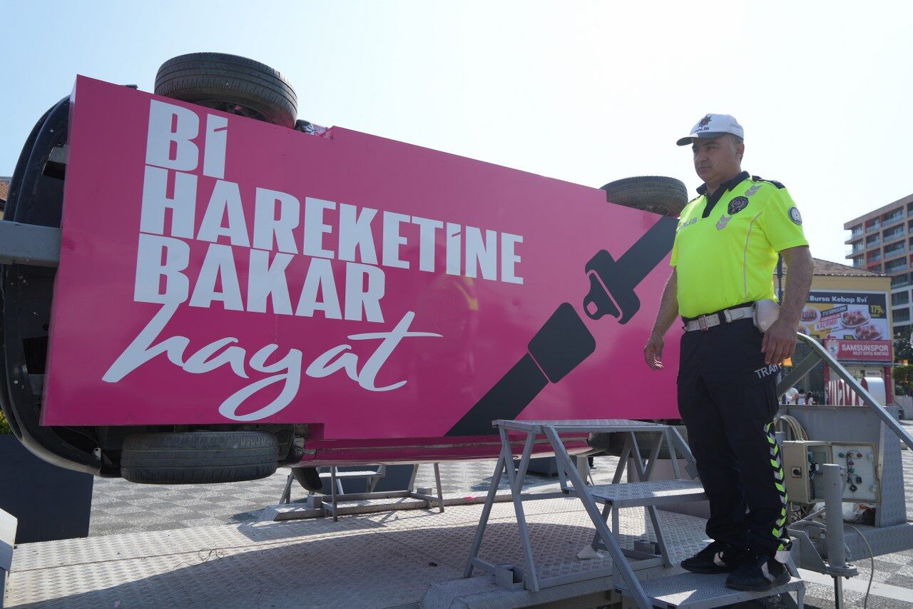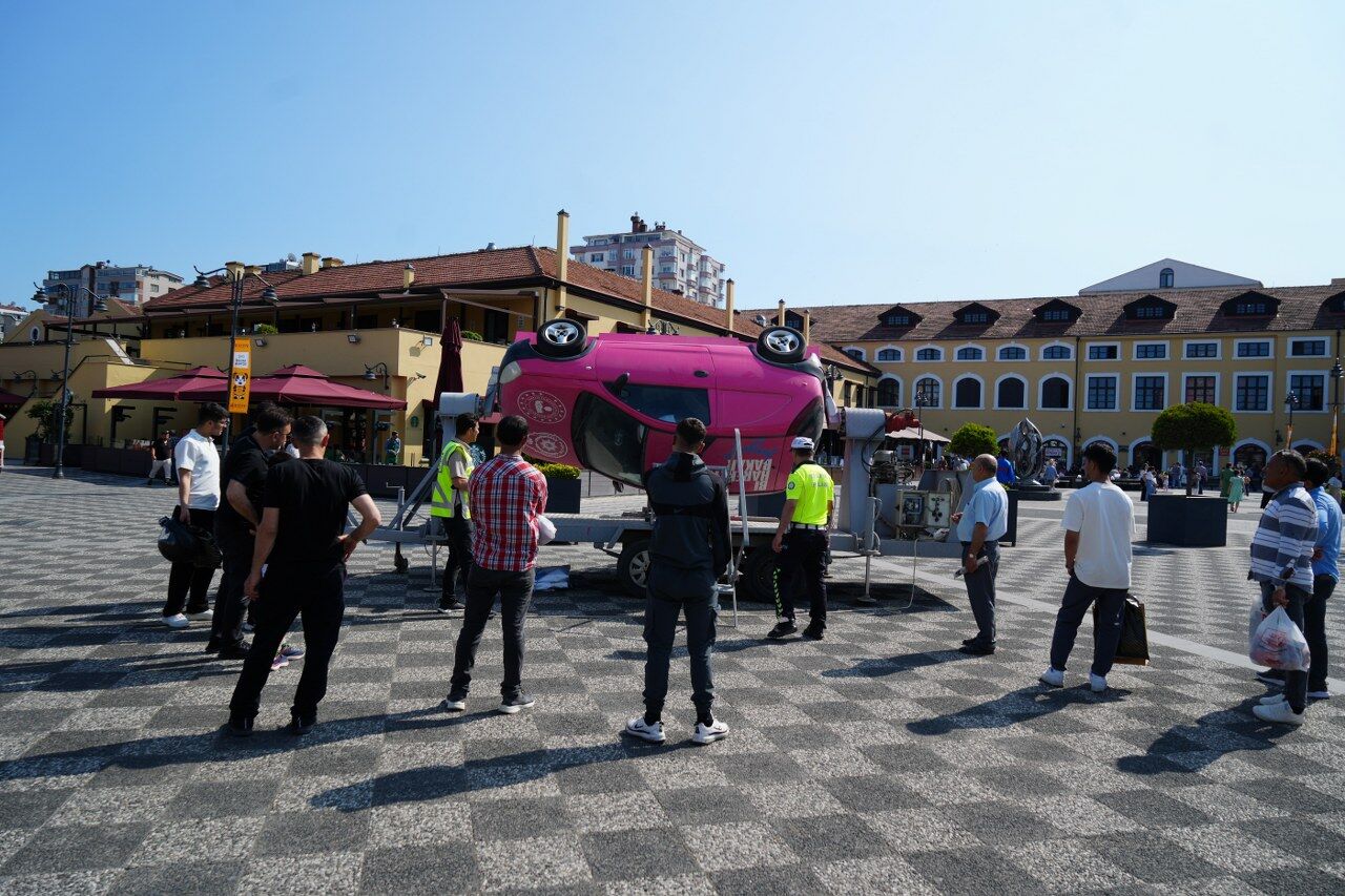 İlkadım ilçesinde bir alışveriş merkezinin etkinlik alanından kurulan simülasyon aracı kontrollü şekilde takla atarken, emniyet kemerinin hayat kurtarıcı rolü katılımcılara uygulamalı olarak anlatıldı.