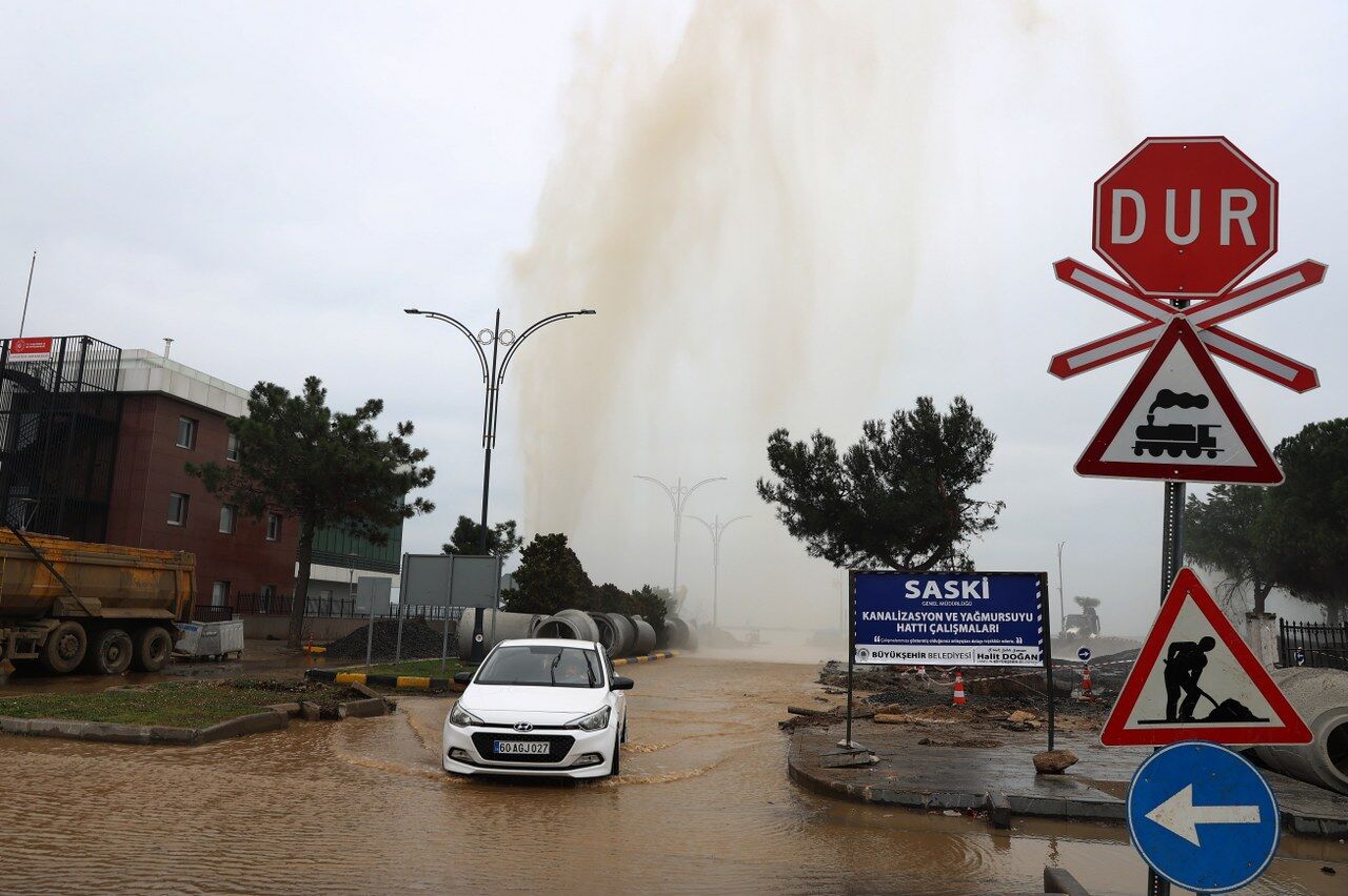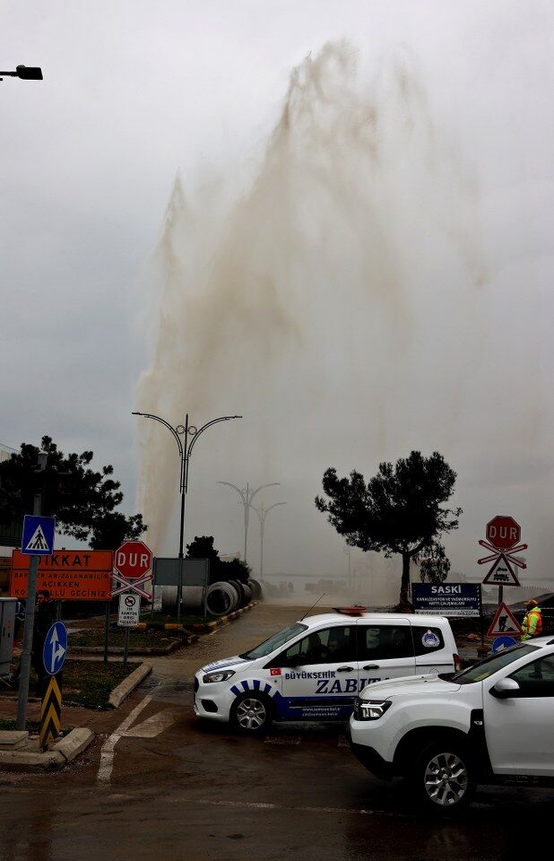 Patlamanın ardından metrelerce yükseğe çıkan tazyikli su, çevredeki yolları su altında bıraktı.