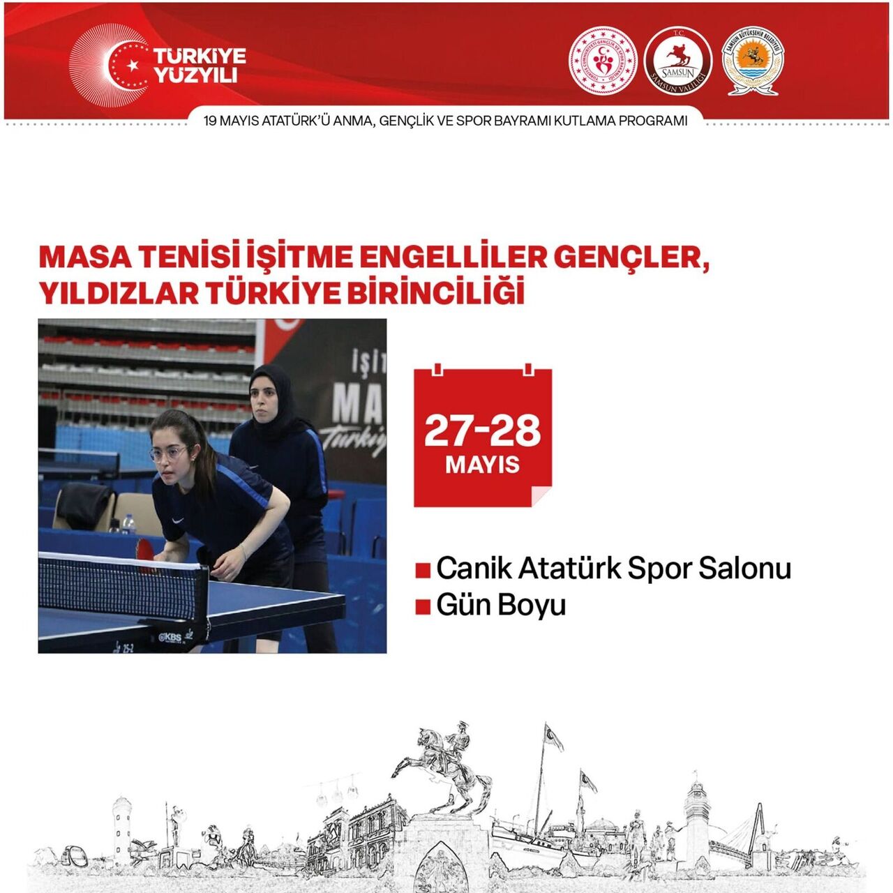 İşitme Engelliler Gençler ve Yıldızlar Türkiye Birinciliği müsabakaları, 27-28 Mayıs tarihlerinde Canik Atatürk Spor Salonu’nda düzenlenecek. İki gün sürecek turnuvada, ülkenin dört bir yanından gelen işitme engelli genç sporcular masa tenisi branşında hem bireysel hem de takım mücadelelerine katılacak.