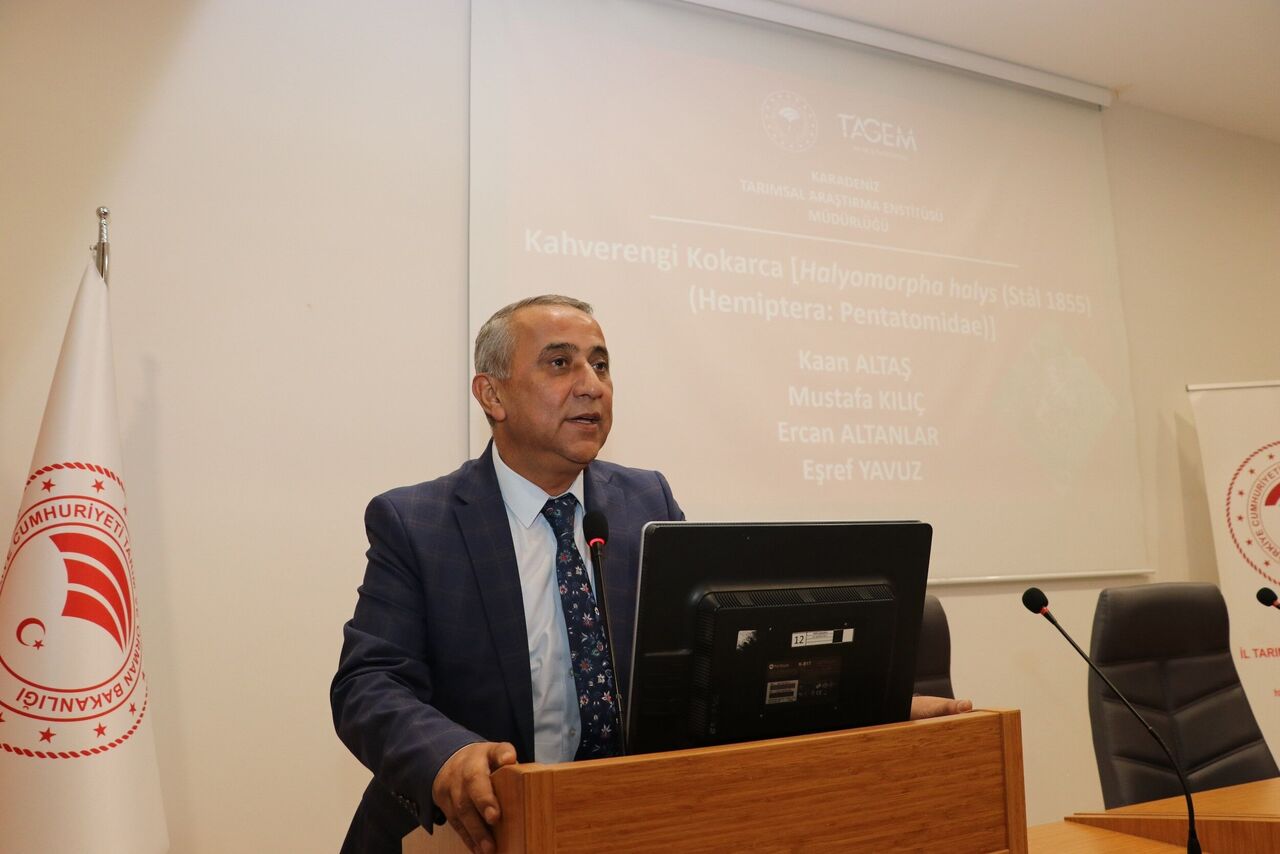 Toplantıda açılış konuşması yapan Samsun İl Tarım ve Orman Müdürü İbrahim Sağlam, “Kahverengi kokarca, bölgemiz ve ilimiz ekonomisi için başta fındık olmak üzere önemli birçok tarımsal üründe yüksek bir zarar meydana getirme kapasitesine sahiptir. Dolayısıyla zararlı ile zamanında ve etkin bir şekilde tarım müdürlüğümüz ve KTAE koordinasyonunda 17 ilçe müdürlüğümüz ve tüm paydaş kurum ve kuruluşlarla birlikte bakanlık acil eylem planı çerçevesinde iyi ve başarılı bir mücadele ortaya koyabileceğiz. Bu amaçla; koordinatör araştırma enstitüsü olan Karadeniz Tarımsal Araştırma Enstitüsü’nde kurulan Karadeniz Biyolojik Mücadele Laboratuvarında, kahverengi kokarcanın doğal düşmanı olan samuray arıcığının (Trissolcus japonicus) üretilerek doğaya salınması ile zararlıya karşı, çevre dostu, bir biyolojik mücadele yöntemi etkin bir rol oynayacaktır” diye konuştu.