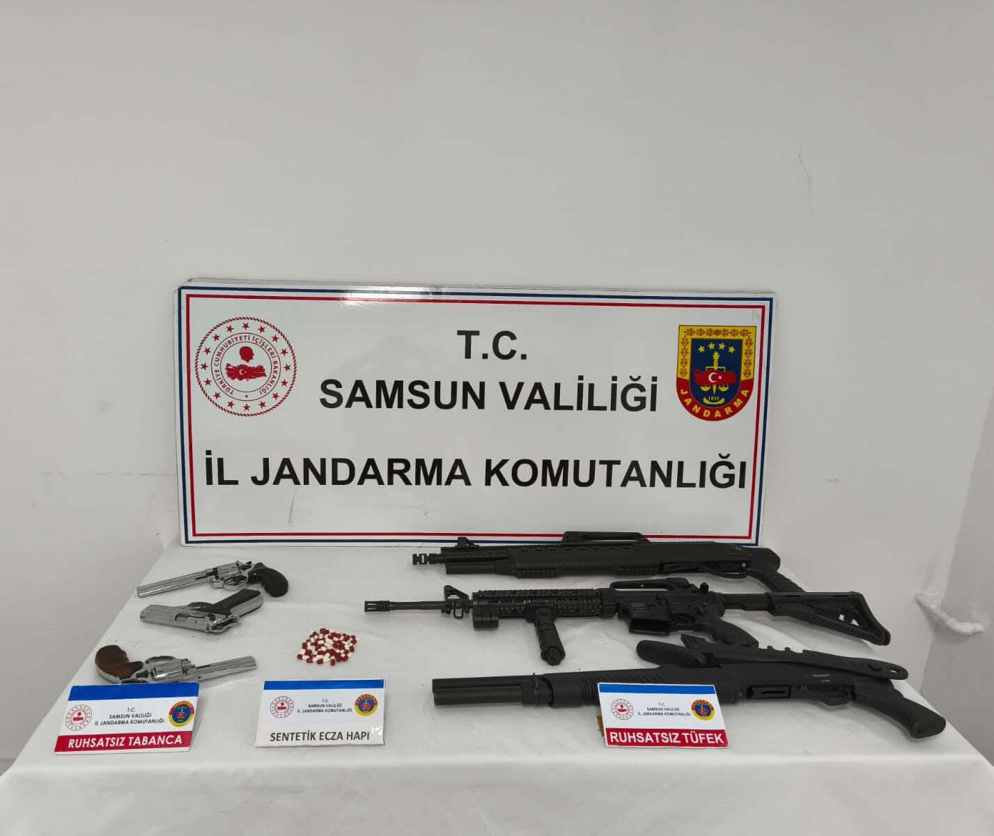 Şahsın ikametinde yapılan aramada 47 adet sentetik ecza hapı, 3 adet ruhsatsız av tüfeği ve 3 adet ruhsatsız tabanca ele geçirildi.
