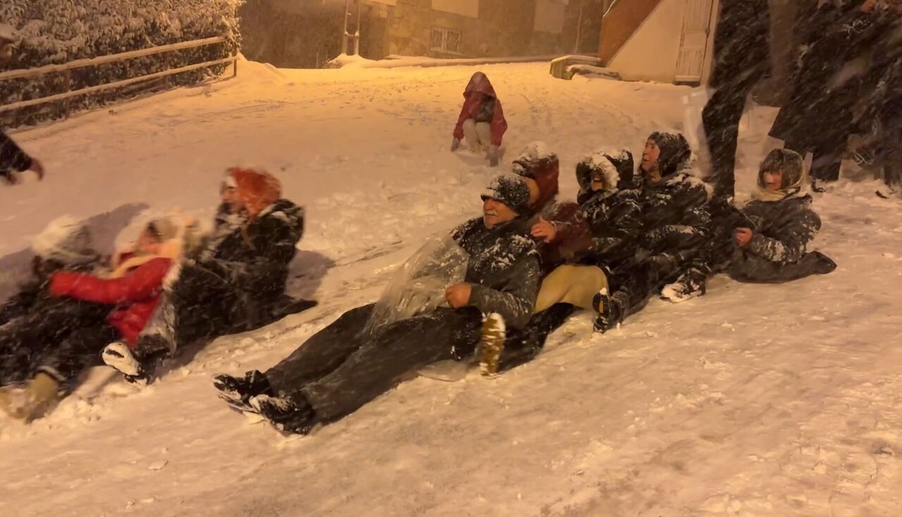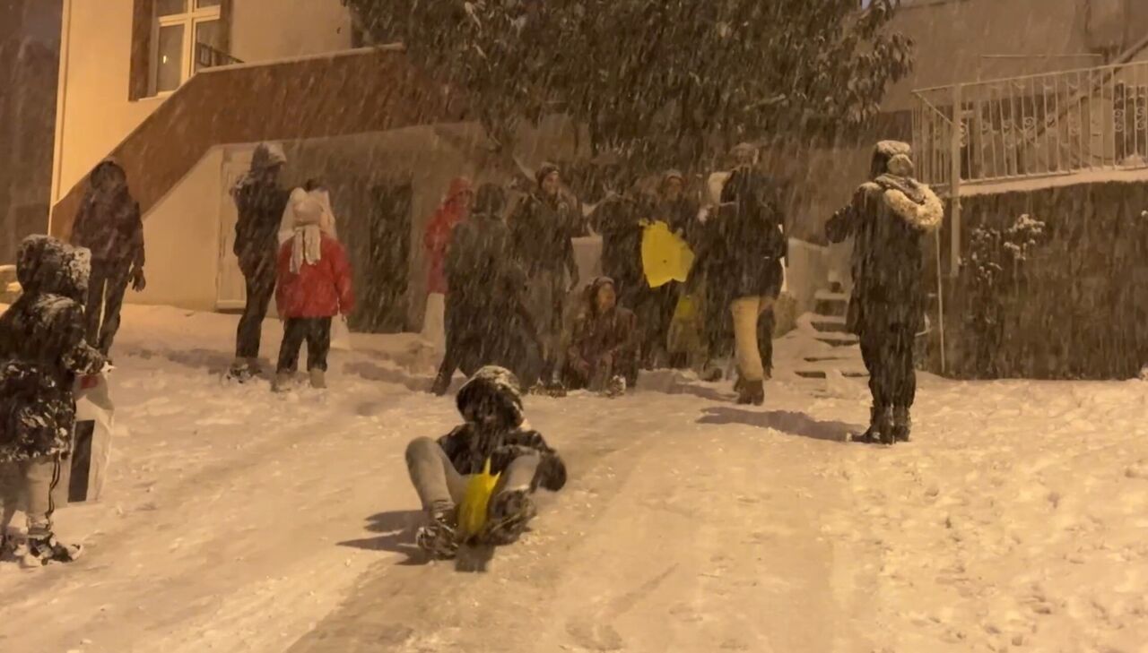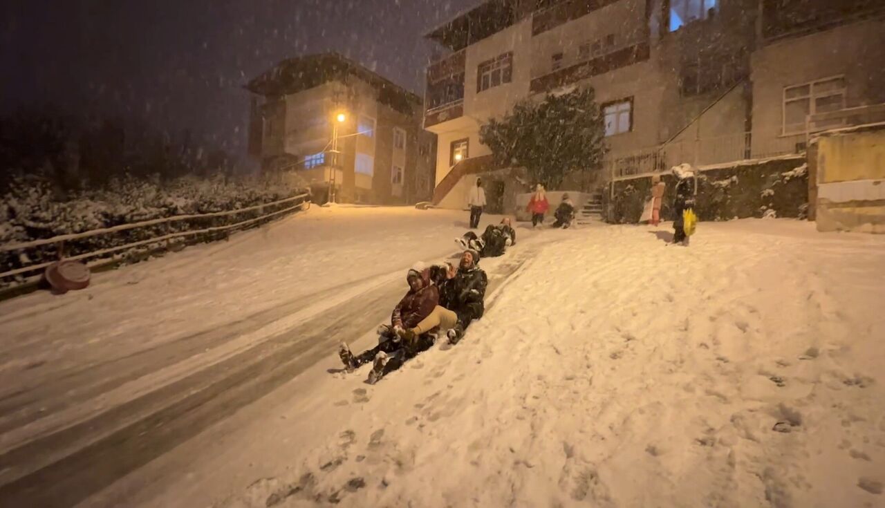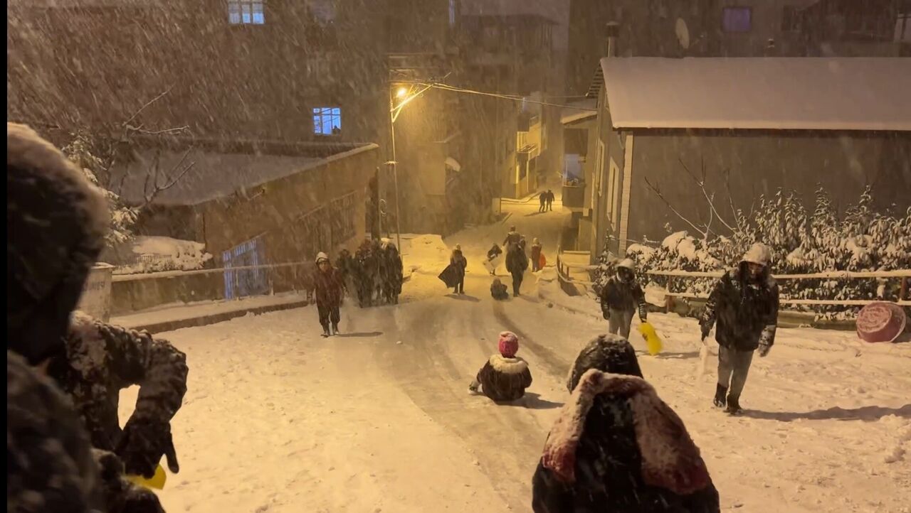 Samsun'da akşam saatlerinde aniden bastıran kar yağışı, kısa sürede kenti beyaza bürüdü. Karın tadını çıkarmak isteyen vatandaşlar ise evlerinden getirdikleri poşetler ve leğenlerle sokakları kayak pistine çevirdi.