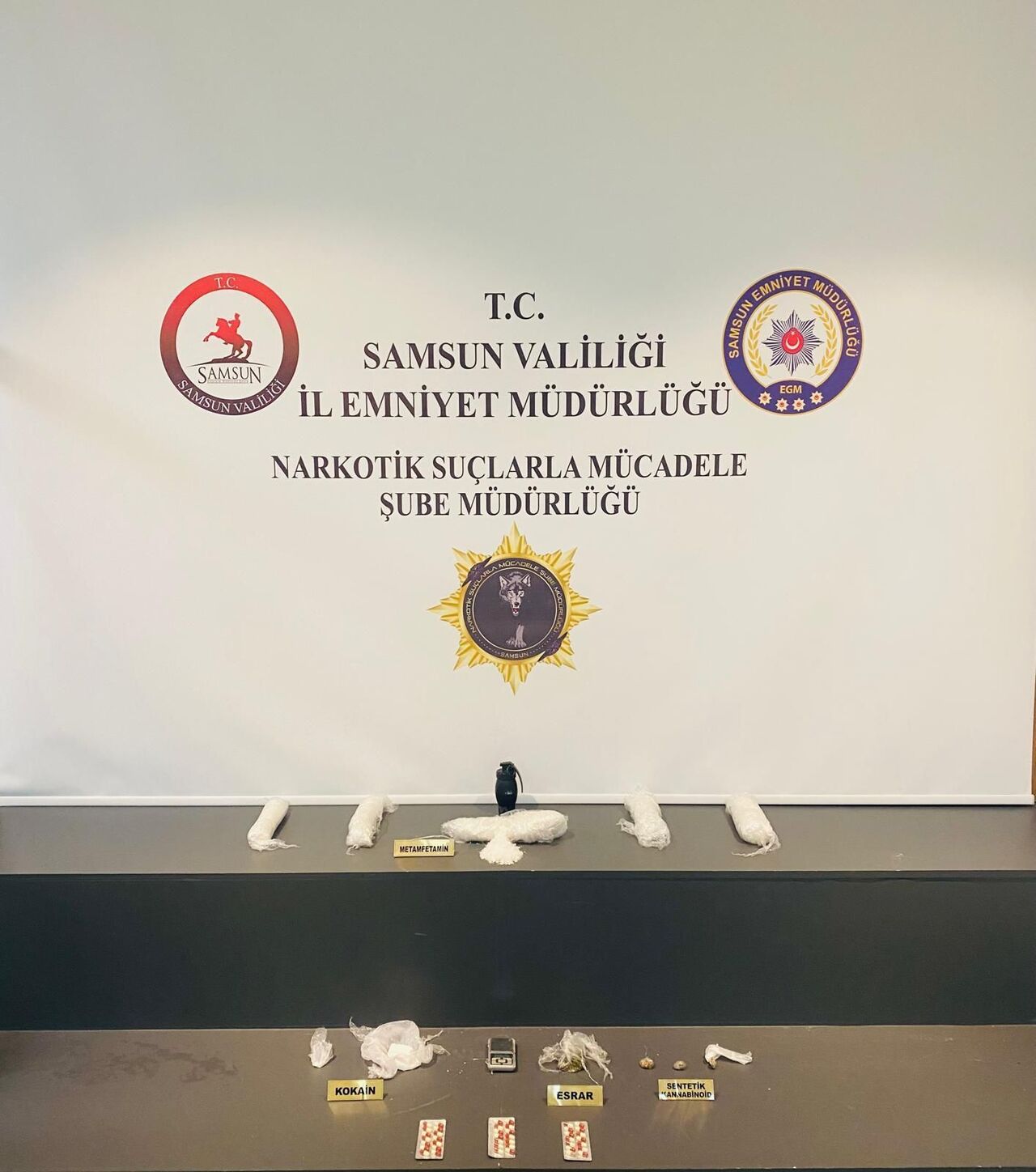 Yapılan aramada, 2 kilo 225 gram metamfetamin, 63 gram kokain, 52 adet sentetik ecza, 8,25 gram esrar, 4,09 gram sentetik kannabinoid, 1 adet hassas terazi