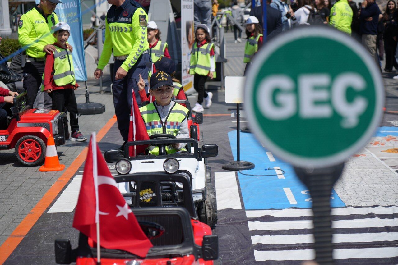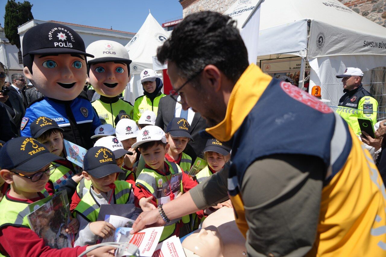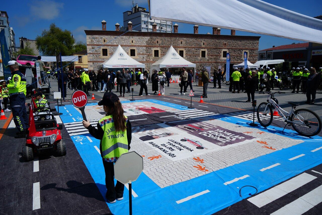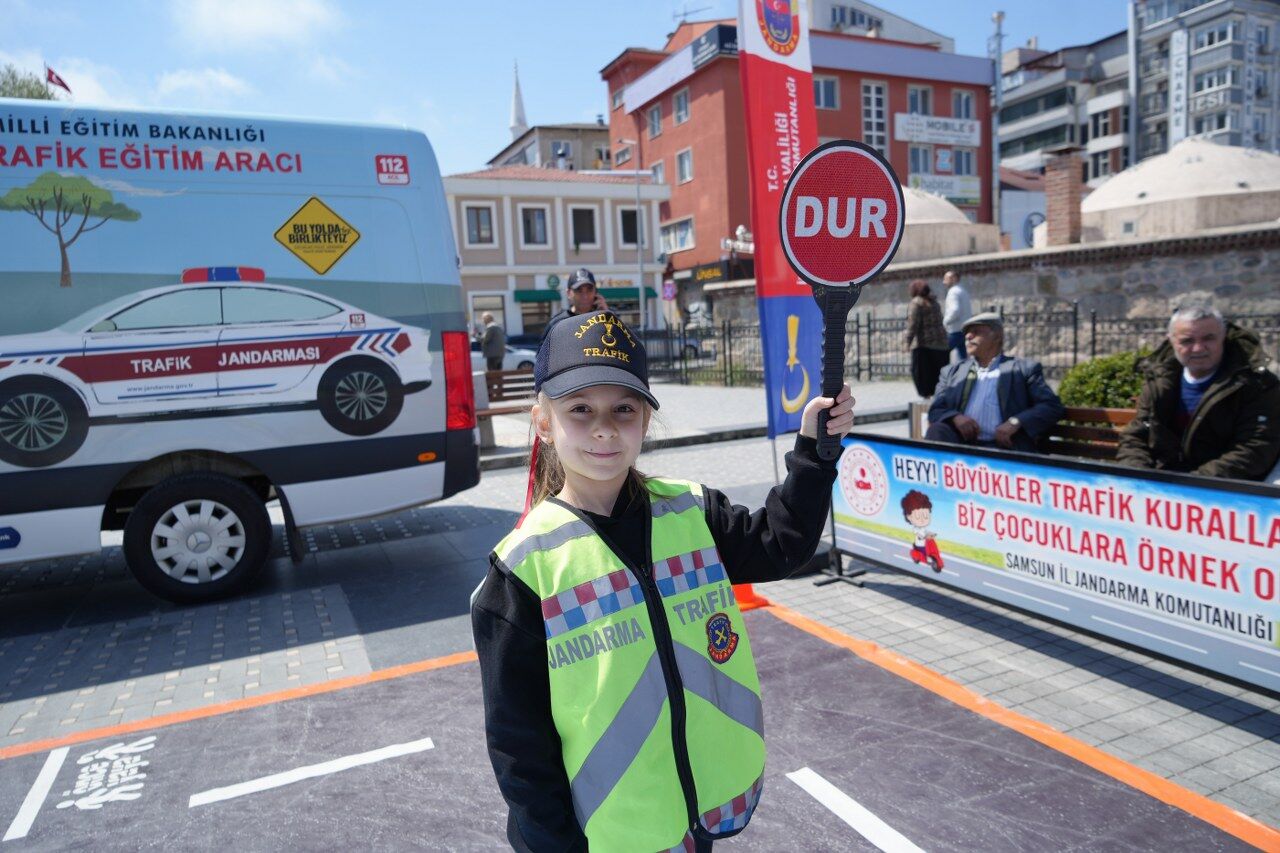 3-9 Mayıs Karayolu Trafik Haftası dolayısıyla Samsun'da Saathane Meydanı'nda stantlar ve eğitici parkurlar kuruldu. Polis, jandarma şapkası ile yeleği giyen minikler hem eğlendi hem öğrendi.