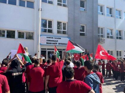 Etkinlik kapsamında öğrenciler, öğretmenlerinin rehberliğinde Filistin bayrakları taşıdı ve Gazze’de yaşanan insani dramın son bulması için temennilerde bulundu.