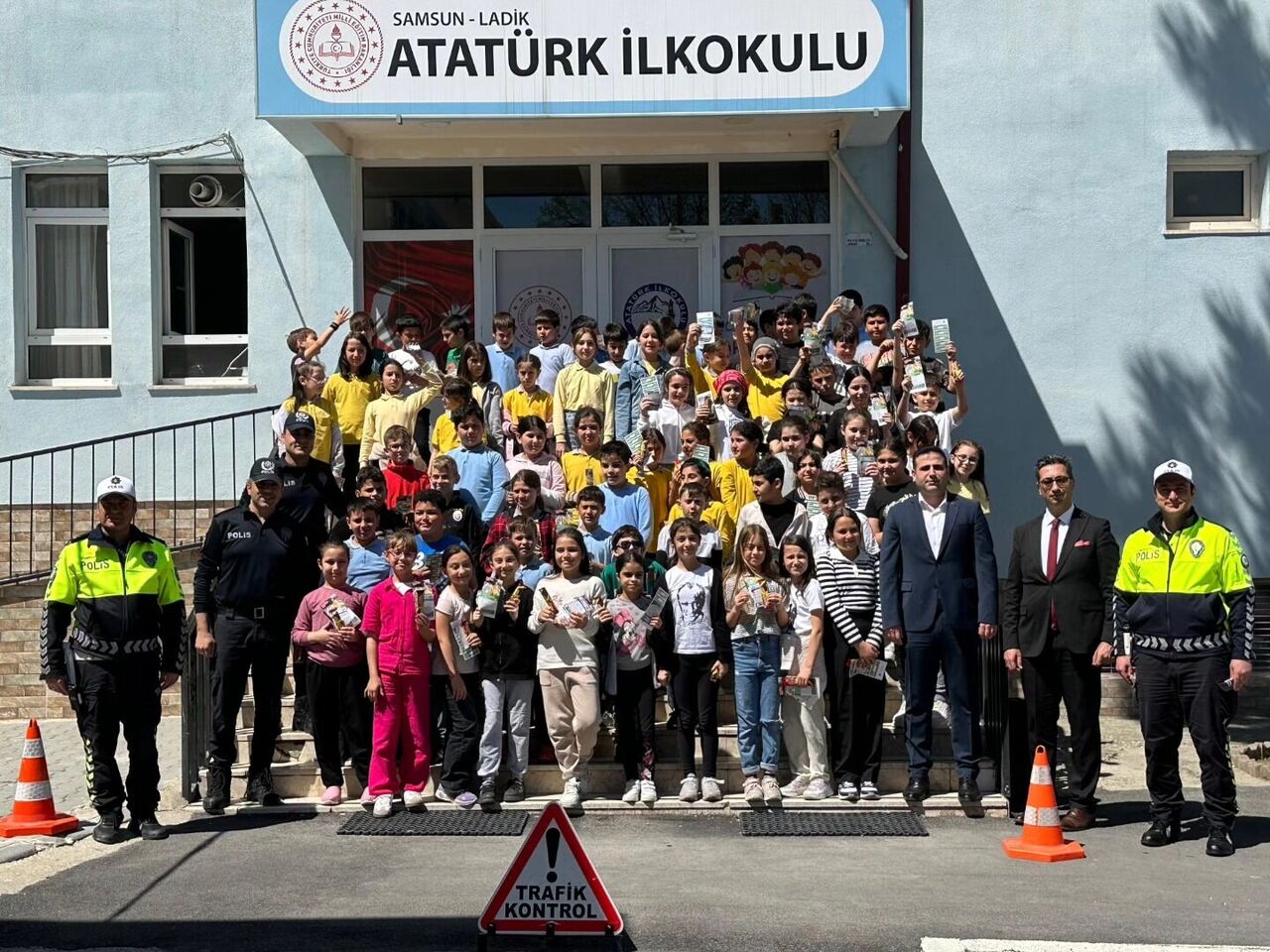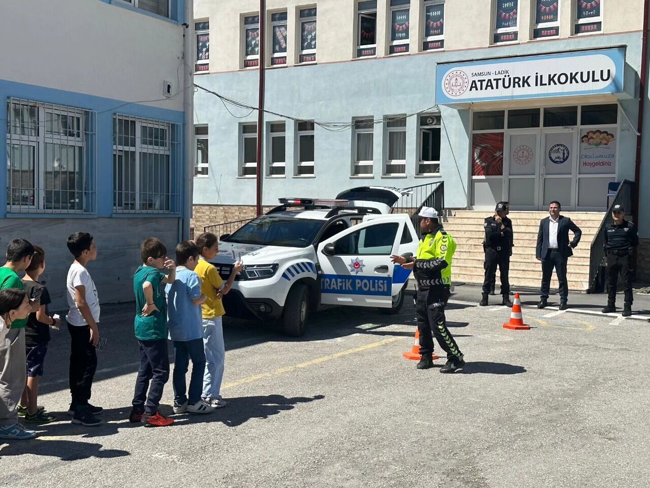 Ladik İlçe Emniyet Amirliği trafik ekipleri tarafından Atatürk İlkokulunda verilen seminer sonrası trafik kuralları, bahçede uygulamalı olarak anlatıldı.