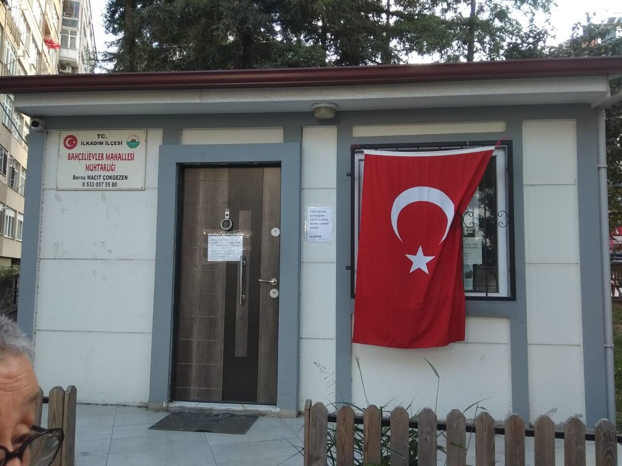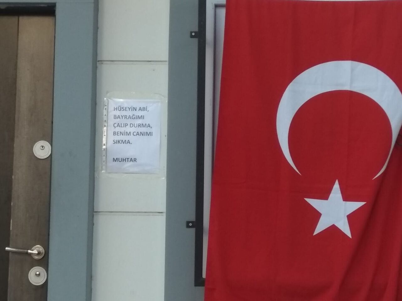 Muhtarlık binasının önüne astığı Türk Bayrağı çalınan muhtar Berna Macit Çokgezen, duvara yazdığı notla, "Hüseyin abi, bayrağımı çalıp durma, benim canımı sıkma" diyerek uyarıda bulundu.