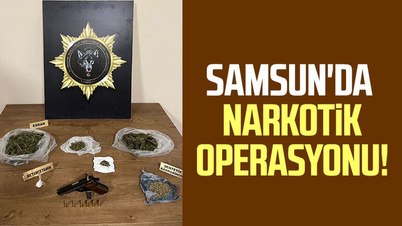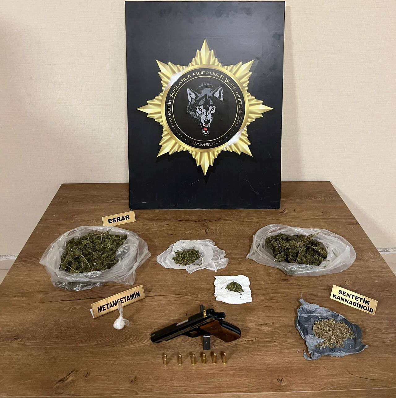 Edinilen bilgiye göre, Samsun Cumhuriyet Başsavcılığı koordinesinde uyuşturucu ile mücadele çerçevesinde çalışma yapan Samsun Emniyet Müdürlüğü Narkotik Suçlarla Mücadele Şube Müdürlüğü ekipleri, Tekkeköy ilçesi ve İlkadım ilçesinde bulunan Çiftlik Mahallesi"nde 189,07 gram esrar, 7,68 gram bonzai (sentetik kannabinoid), 5 gram metamfetamin, 1 adet ruhsatsız tabanca, 6 adet tabanca fişeği ve 1 adet uyuşturucu madde kullanımına yarar aparat ele geçirdi.