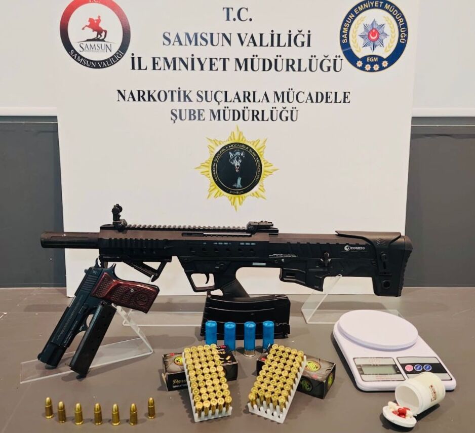 İkamette yapılan aramada ruhsatsız tabanca, ruhsatsız tüfek, 108 tabanca fişeği, 4 tüfek kartuşu, hassas terazi ve 7 sentetik ecza hapı ele geçirildi.