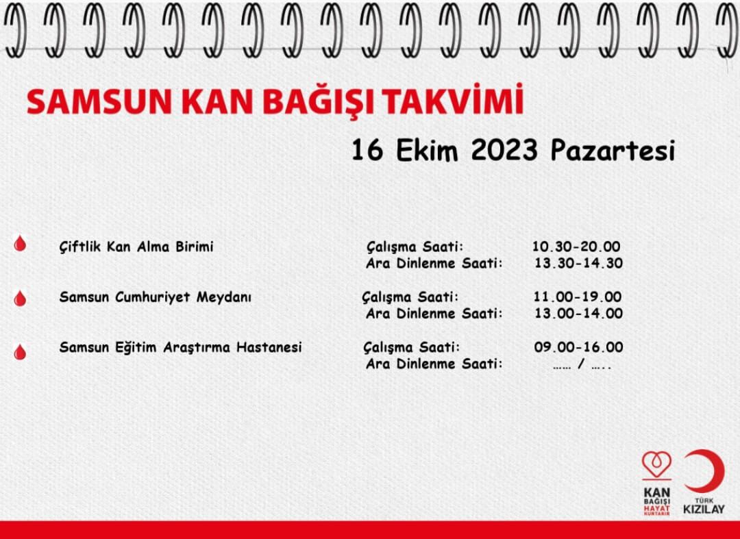 Kızılay'a kan bağışında bulunmak isteyenler için 16 Ekim Pazar Samsun'da kurulan kan bağış noktaları şu şekilde;