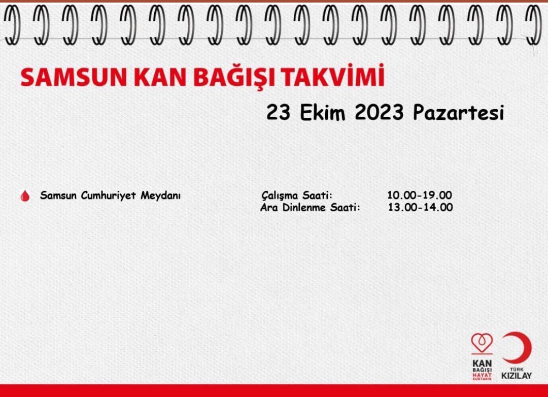 Kızılay'a kan bağışında bulunmak isteyenler için 23 Ekim Pazartesi Samsun'da kurulan kan bağış noktaları şu şekilde;