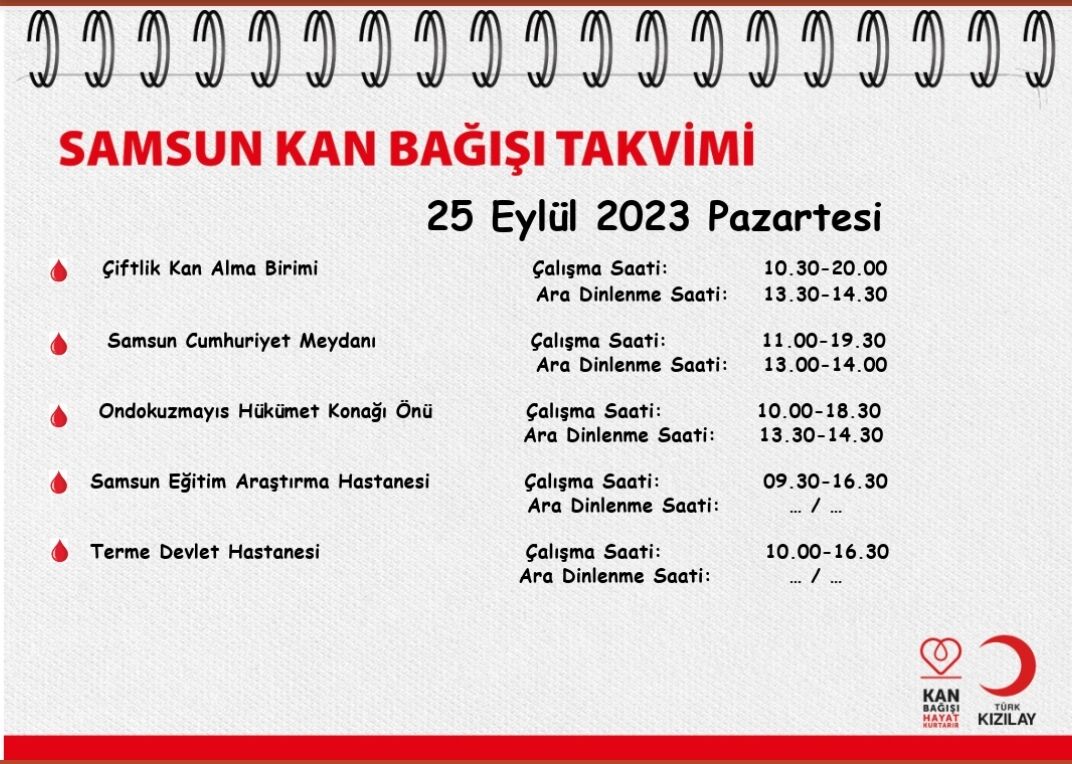 Kızılay'a kan bağışında bulunmak isteyenler için 25 Eylül Pazartesi Samsun'da kurulan kan bağış noktaları şu şekilde;