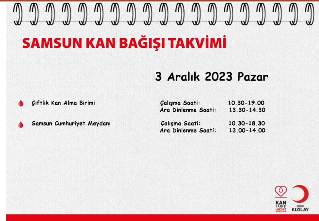 Kızılay'a kan bağışında bulunmak isteyenler için 3 Aralık Pazar Samsun'da kurulan kan bağış noktaları şu şekilde;