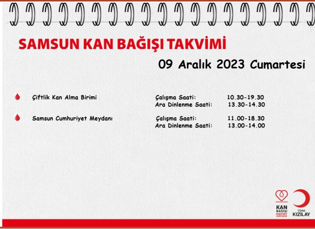 Kızılay'a kan bağışında bulunmak isteyenler için 9 Aralık Cumartesi Samsun'da kurulan kan bağış noktaları şu şekilde;