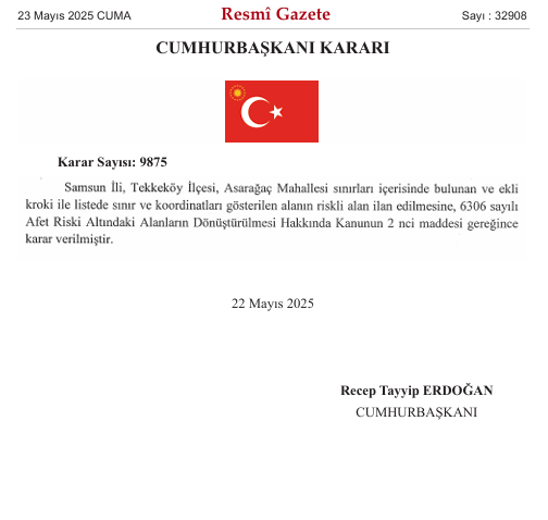 Samsun’un Tekkeköy ilçesine bağlı Asarağaç Mahallesi’nde heyelanların meydana geldiği alan, 6306 sayılı "Afet Riski Altındaki Alanların Dönüştürülmesi Hakkında Kanun" kapsamında riskli alan olarak ilan edildi. Söz konusu karar, Cumhurbaşkanı tarafından alınarak 22 Mayıs 2025 tarihli Resmî Gazete’de yayımlandı. 6306 sayılı Afet Riski Altındaki Alanların Dönüştürülmesi Hakkında Kanun kapsamında alınan kararla birlikte, Demir Otomotiv’in bulunduğu noktadan Kirazlık Deresi’ne kadar olan bölgedeki yapılaşmalar kaldırılacak. Afet riski taşıdığı tespit edilen alanın sınır ve koordinatları, karara ekli kroki ve listede detaylı şekilde yer aldı.