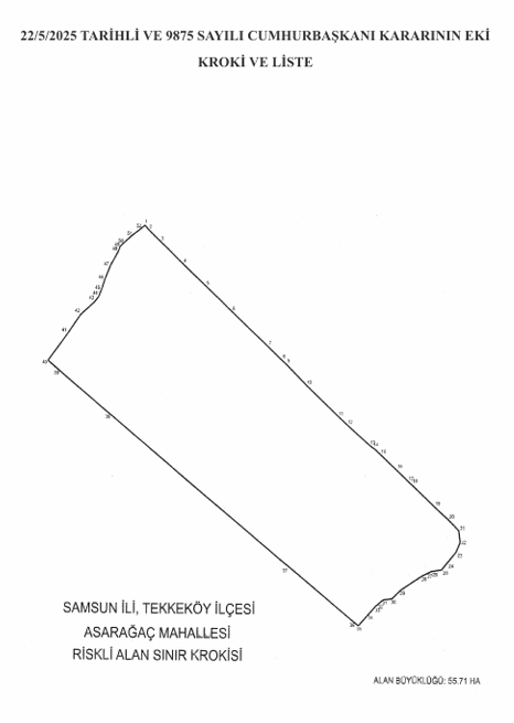 Cumhurbaşkanı Recep Tayyip Erdoğan imzasıyla yayımlanan 9875 sayılı karara göre, söz konusu alanın sınır ve koordinatları ekli kroki ve listede ayrıntılı şekilde belirtildi. Karar, afet riski taşıyan bölgelerin dönüştürülmesine yönelik çalışmalar çerçevesinde alındı.