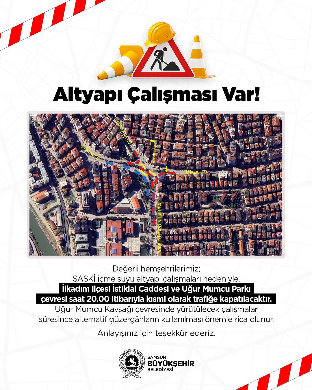 Samsun Büyükşehir Belediyesi'nden yapılan açıklamada, “İlkadım ilçesi İstiklal Caddesi ve Uğur Mumcu Parkı çevresi saat 20.00 itibariyle kısmi olarak trafiğe kapatılacaktır. Yürütülecek çalışmalar sürecinde alternatif güzergahların kullanılmasını önemle rica ediyoruz. Anlayışınız için teşekkür ederiz” ifadelerine yer verildi.