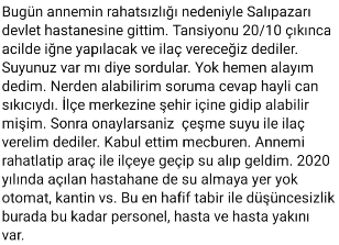 Sosyal medyadan duruma tepki gösteren vatandaş, "Bugün annemin rahatsızlığı nedeniyle Salıpazarı devlet hastanesine gittim. Tansiyonu 20/10 çıkınca acilde iğne yapılacak ve ilaç vereceğiz dediler. Suyunuz var mı diye sordular. Yok hemen alayım dedim. Nerden alabilirim soruma cevap hayli can sıkıcıydı. İlçe merkezine şehir içine gidip alabilir mişim. Sonra onaylarsaniz çeşme suyu ile ilaç verelim dediler. Kabul ettim mecburen. Annemi rahatlatip araç ile ilçeye geçip su alıp geldim. 2020 yılında açılan hastahane de su almaya yer yok otomat, kantin vs. Bu en hafif tabir ile düşüncesizlik burada bu kadar personel, hasta ve hasta yakını var." ifadelerini kullandı.