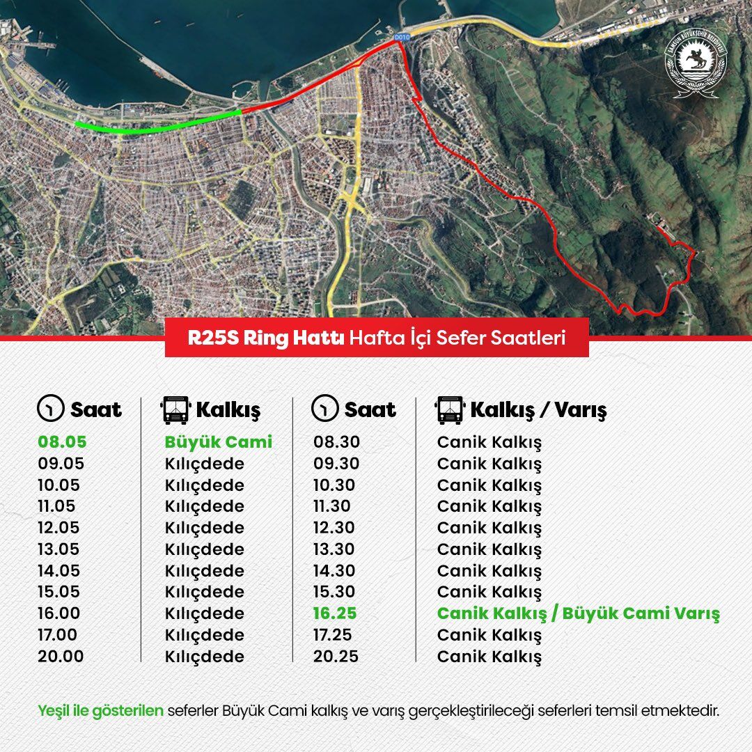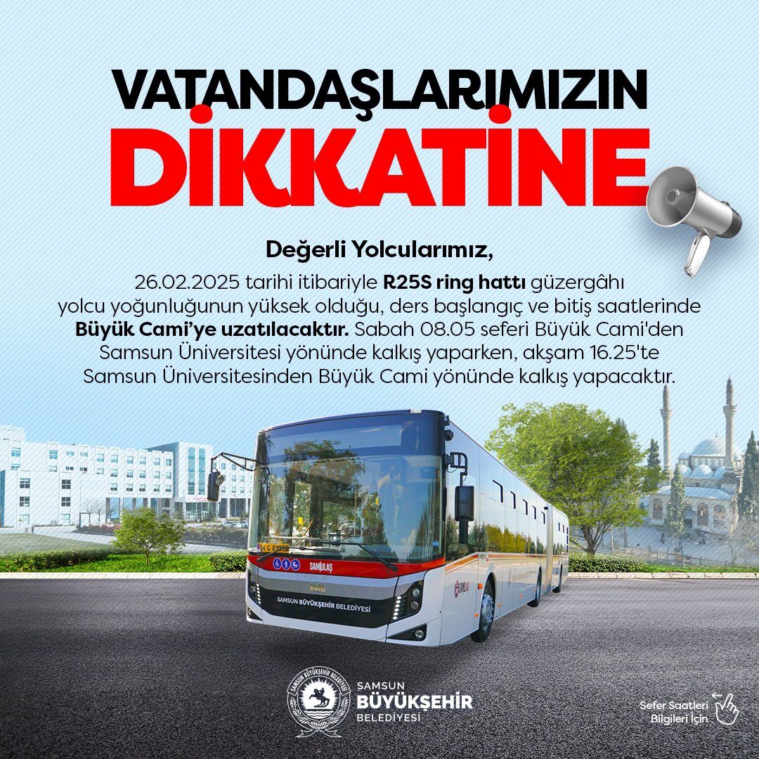 Konu ile ilgili Samsun Büyükşehir Belediyesi'nden yapılan açıklamada şu ifadelere yer verildi: "Kıymetli Vatandaşlarımız; R25S ring hattı güzergahı yarından itibaren yolcu yoğunluğunun yüksek olduğu, ders başlangıç ve bitiş saatlerinde Büyük Cami’ye kadar uzatılacaktır. Sabah 08.05 seferi Büyük Cami'den Samsun Üniversitesi yönünde kalkış yaparken; akşam 16.25'te Samsun Üniversitesi'nden Büyük Cami yönünde kalkış yapacaktır.
