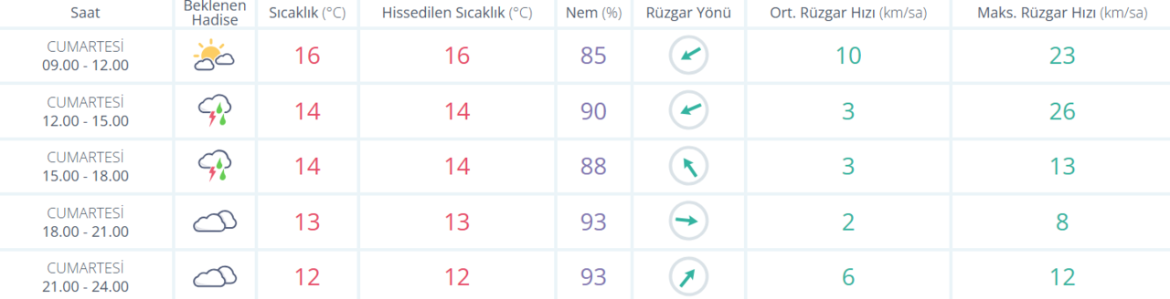 Ancak öğle saatlerinden itibaren hava durumunda önemli bir değişim bekleniyor. 12.00-15.00 ve 15.00-18.00 saatleri arasında gök gürültülü sağanak yağış etkili olacak. Sıcaklık 14 dereceye gerilerken, nem yüzde 90 seviyelerine ulaşacak. Rüzgarın saatte 26 km’ye kadar çıkabileceği tahmin ediliyor.