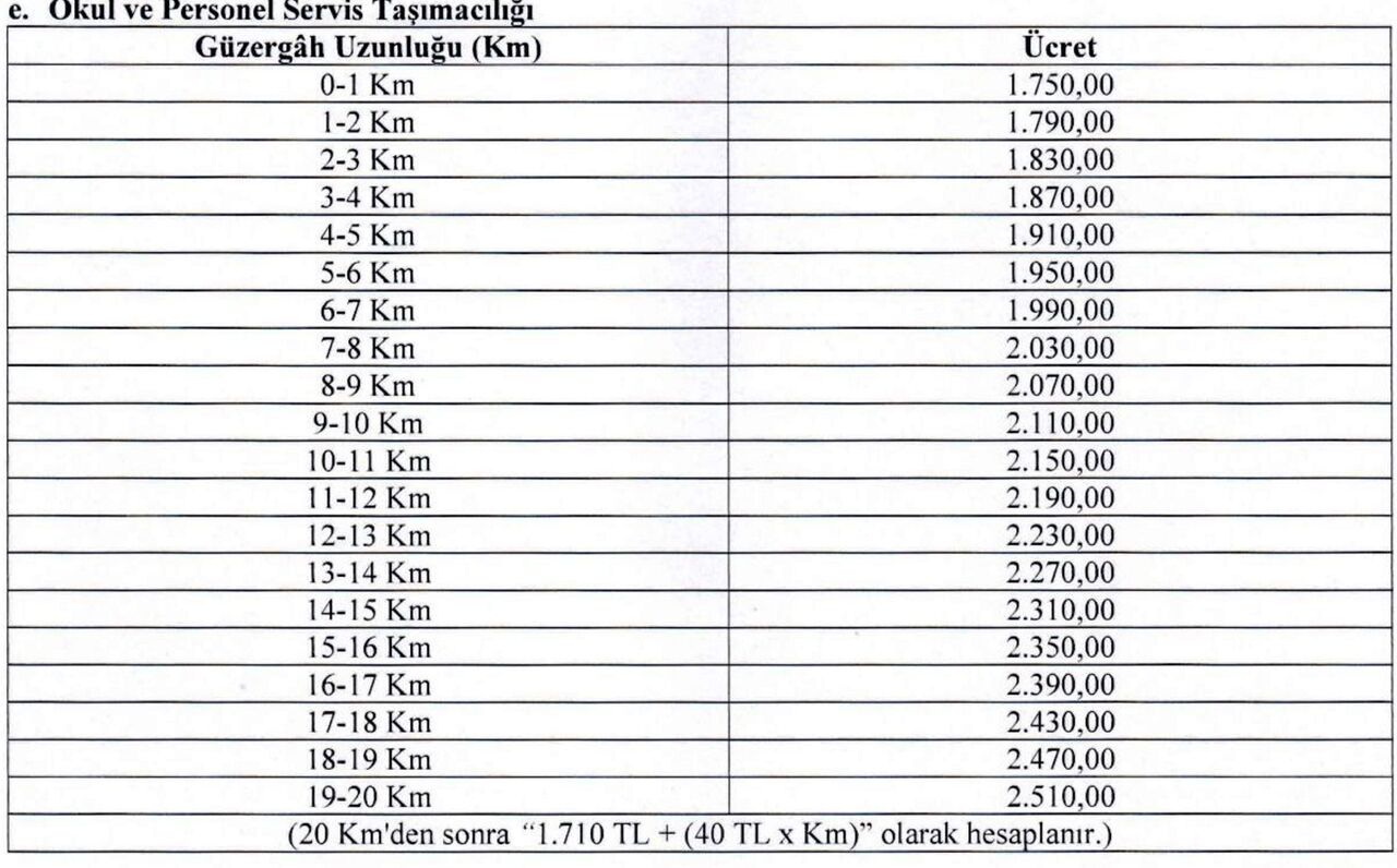 Bu eğitim-öğretim döneminde kullanılacak güzergahlardaki fiyat tarifesi 0-1 km 1750 TL, 1-2 km 1790 TL, 2-3 km 1830 TL, 3-4 km 1870 TL, 4-5 km 1910 TL, 5-6 km 1950 TL, 6-7 km 1990 TL, 7-8 km 2 bin 30 TL, 8-9 km 2 bin 70 TL, 10-11 km 2 bin 150 TL, 11-12 km 2 bin 190 TL, 12-13 km 2 bin 230 TL, 13-14 km 2 bin 270 TL, 14-15 km 2 bin 310 TL, 15-16 km 2 bin 350 TL, 16-17 km 2 bin 390 TL, 17-18 km 2 bin 430 TL, 18-19 km 2 bin 470 TL, 19-20 km ise 2 bin 510 TL olarak belirlendi. Ayrıca tarifede 20 km’den sonrası 1710 + km x 40 TL olarak hesaplanacak.