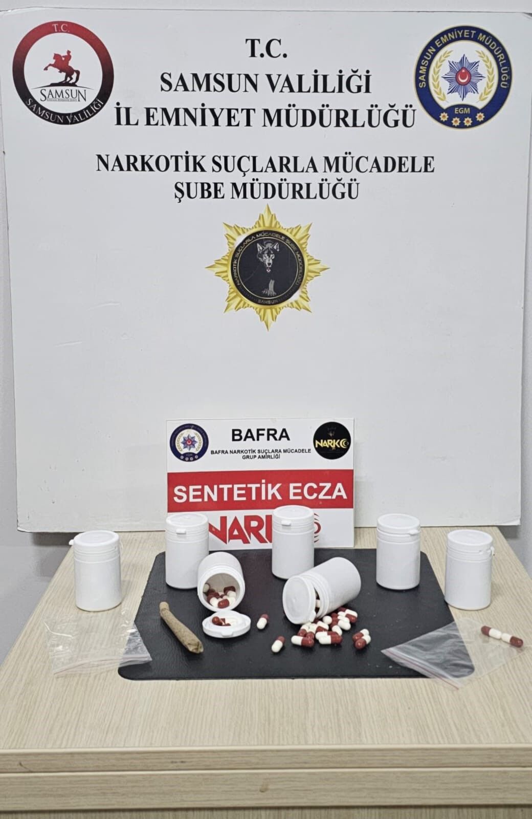 Yapılan aramada 336 adet sentetik hap ve 1 fişek esrar maddesi ele geçirildi.