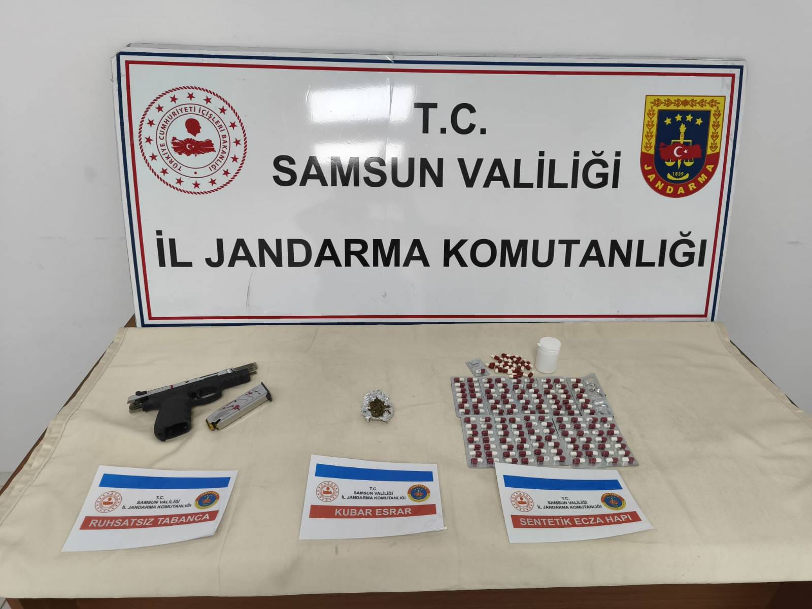 Samsun İl Jandarma Komutanlığı ekipleri tarafından şüphelinin ikametinde yapılan aramada toplam 256 adet uyuşturucu hap ile bir miktar uyuşturucu madde ve 1 adet ruhsatsız tabanca ele geçirildi.