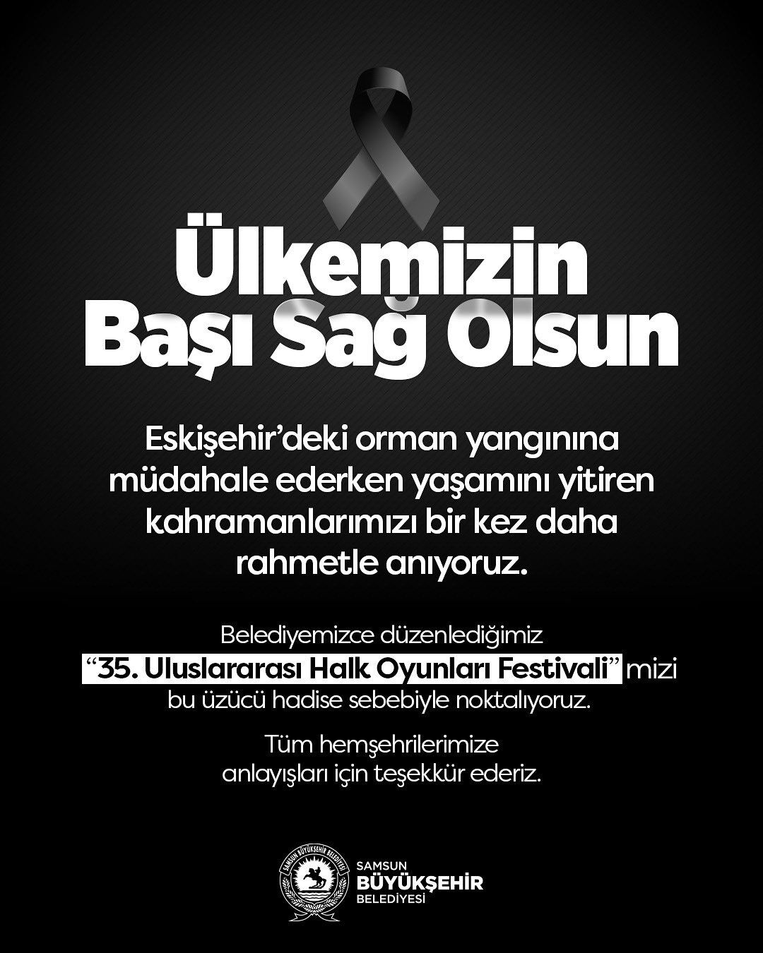 Samsun Büyükşehir Belediyesi tarafından düzenlenen “35. Uluslararası Halk Oyunları Festivali”, yaşanan elim olay nedeniyle sonlandırıldı. Başkan Doğan, “Belediyemizce düzenlediğimiz 35. Uluslararası Halk Oyunları Festivalimizi bu üzücü hadise sebebiyle noktalıyoruz. Tüm hemşehrilerimize anlayışları için teşekkür ederiz.” diyerek kamuoyunu bilgilendirdi.