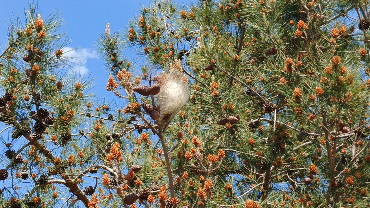 Kış aylarında daha belirgin hale gelen çam kese böcekleri, çam ağaçlarının ibrelerini yiyerek gelişimlerini olumsuz etkiliyor. Uzmanlar, uzun süreli yoğunluk yaşanması halinde ağaçların zayıflayabileceği ve zamanla kuruyabileceği uyarısında bulunuyor.