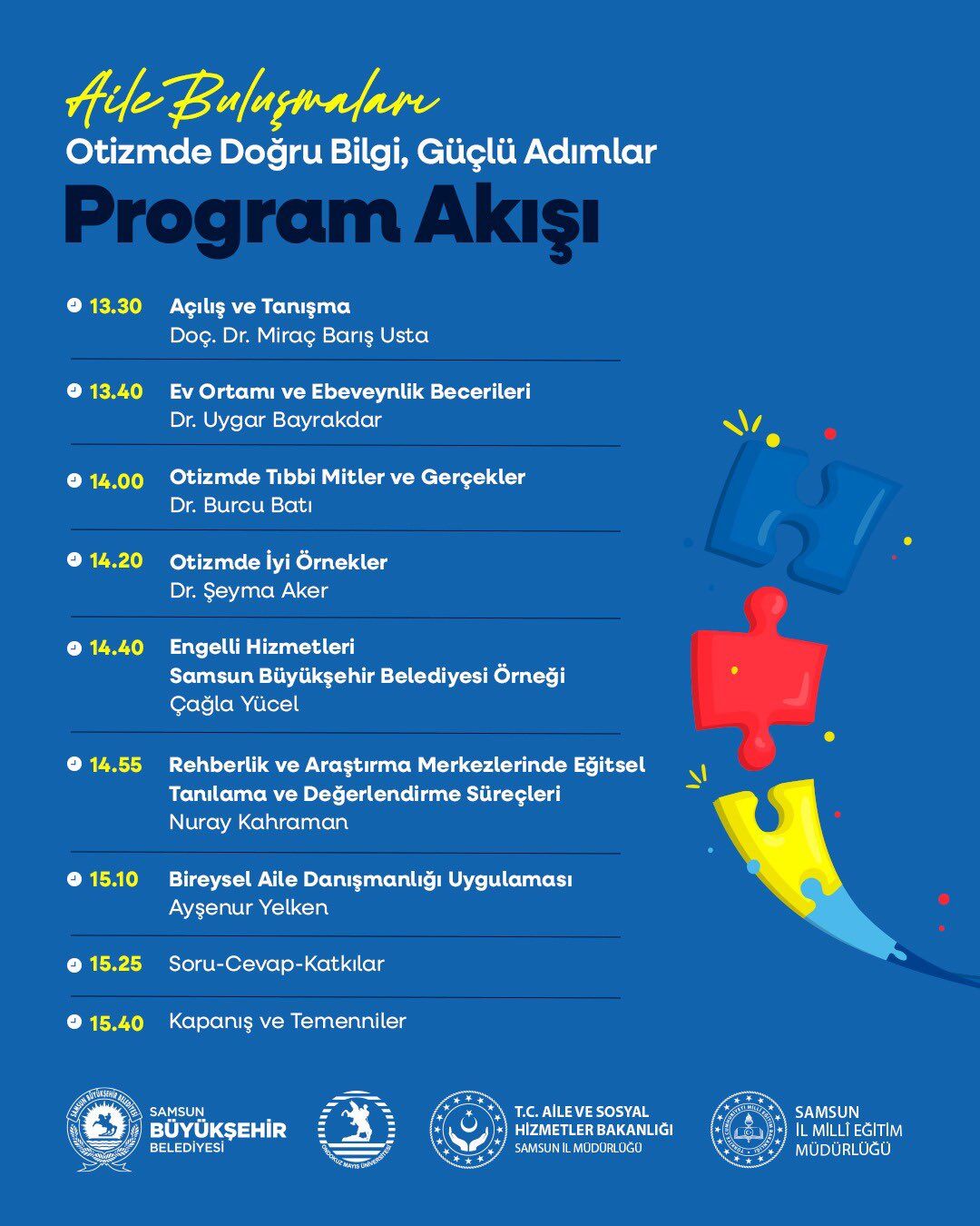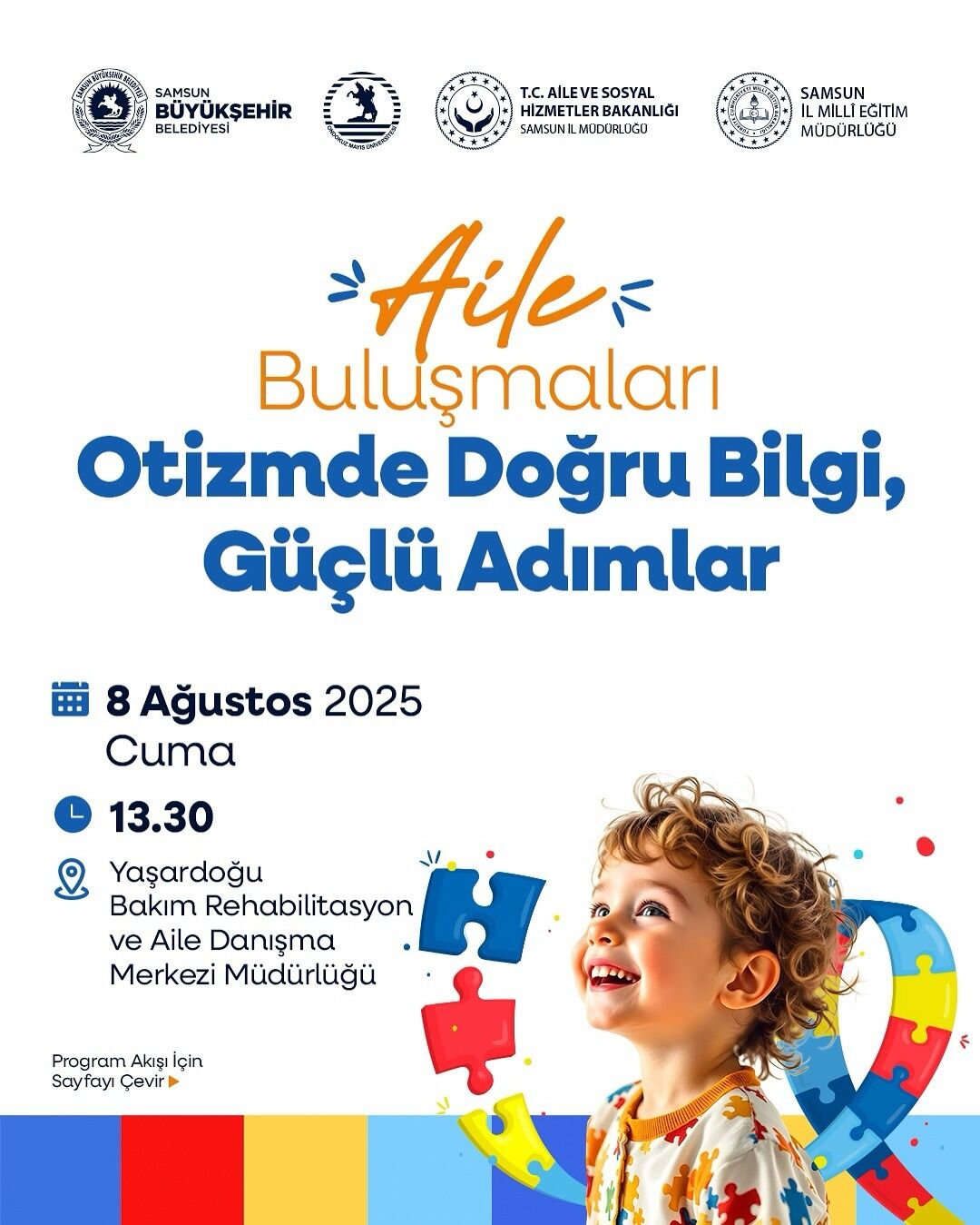 Samsun Büyükşehir Belediyesi, Ondokuz Mayıs Üniversitesi, Aile ve Sosyal Hizmetler İl Müdürlüğü ve İl Milli Eğitim Müdürlüğü iş birliğiyle hayata geçirilen “Aile Buluşmaları: Otizmde Doğru Bilgi, Güçlü Adımlar” programı, alanında uzman konukların katılımıyla gerçekleşecek.
