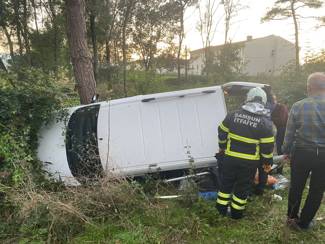 Canan C'nin (29) kullandığı 55 EK 058 plakalı hafif ticari araç, Samsun-Sinop kara yolu Karaköy Mahallesi mevkisinde köpeğe çarpmamak için manevra yapılınca hendeğe devrildi.