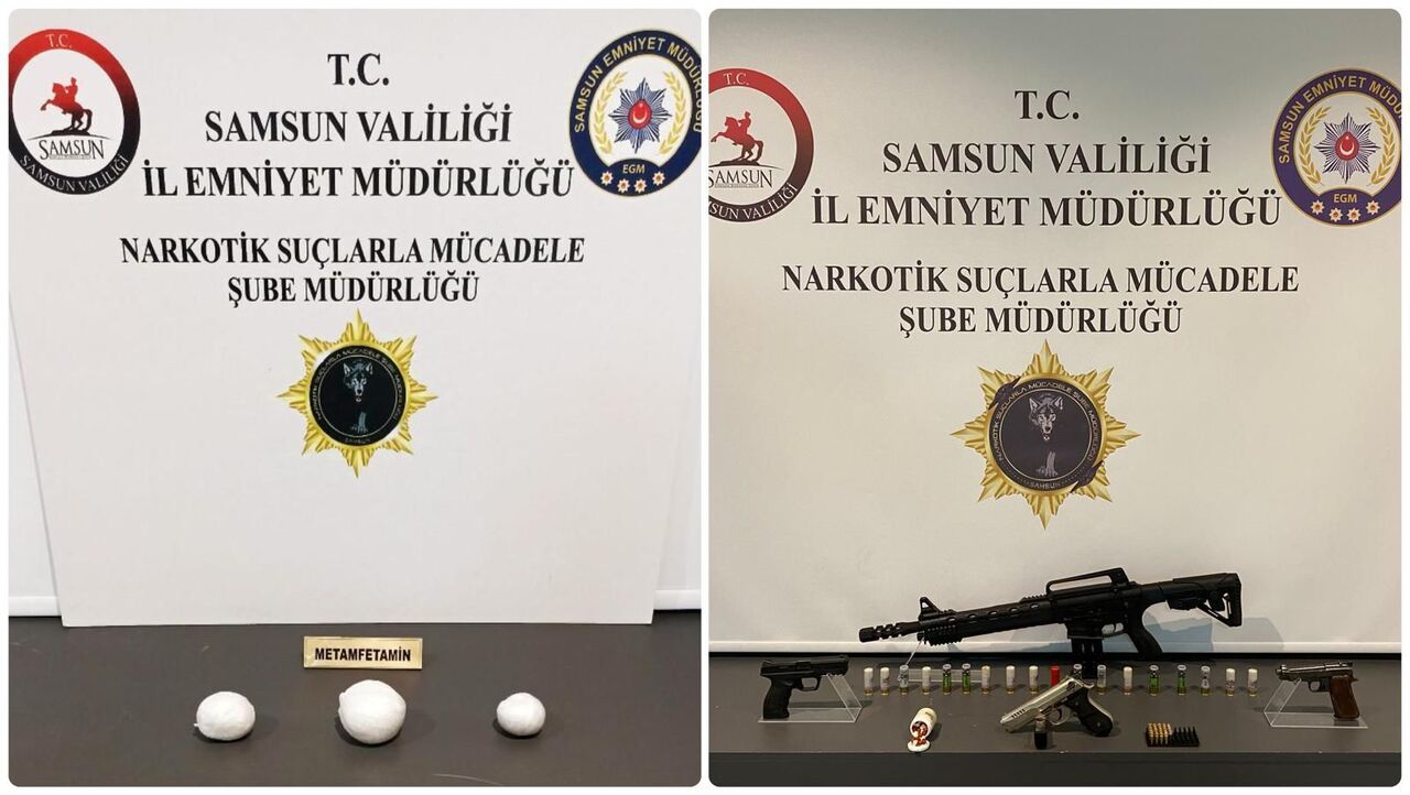 Narkotik dedektör köpekleriyle belirlenen adreslerde yapılan aramalarda, 267,14 gram sentetik uyuşturucu, 4 kilo 266 gram sentetik uyuşturucu yapımında kullanılan madde, 80 sentetik ecza hapı, 2,71 gram esrar, esrarlı sigara, 2 hassas terazi, 2 ruhsatsız tabanca, ruhsatsız tüfek, kurusıkı tabanca ile 51 tabanca fişeği ele geçirildi.