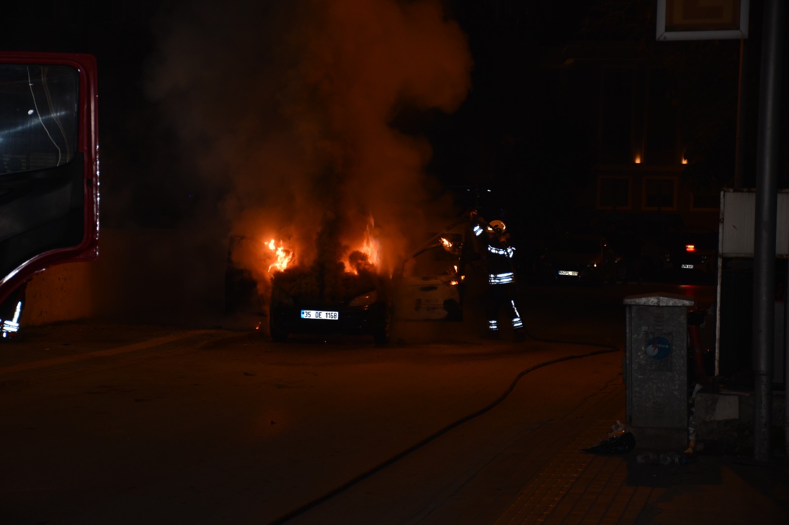 Fazıl Ahmet Paşa Mahallesi 121. Sokak'ta park halinde bulunan 35 DE 1168 plakalı otomobil, henüz belirlenemeyen nedenle yanmaya başladı.