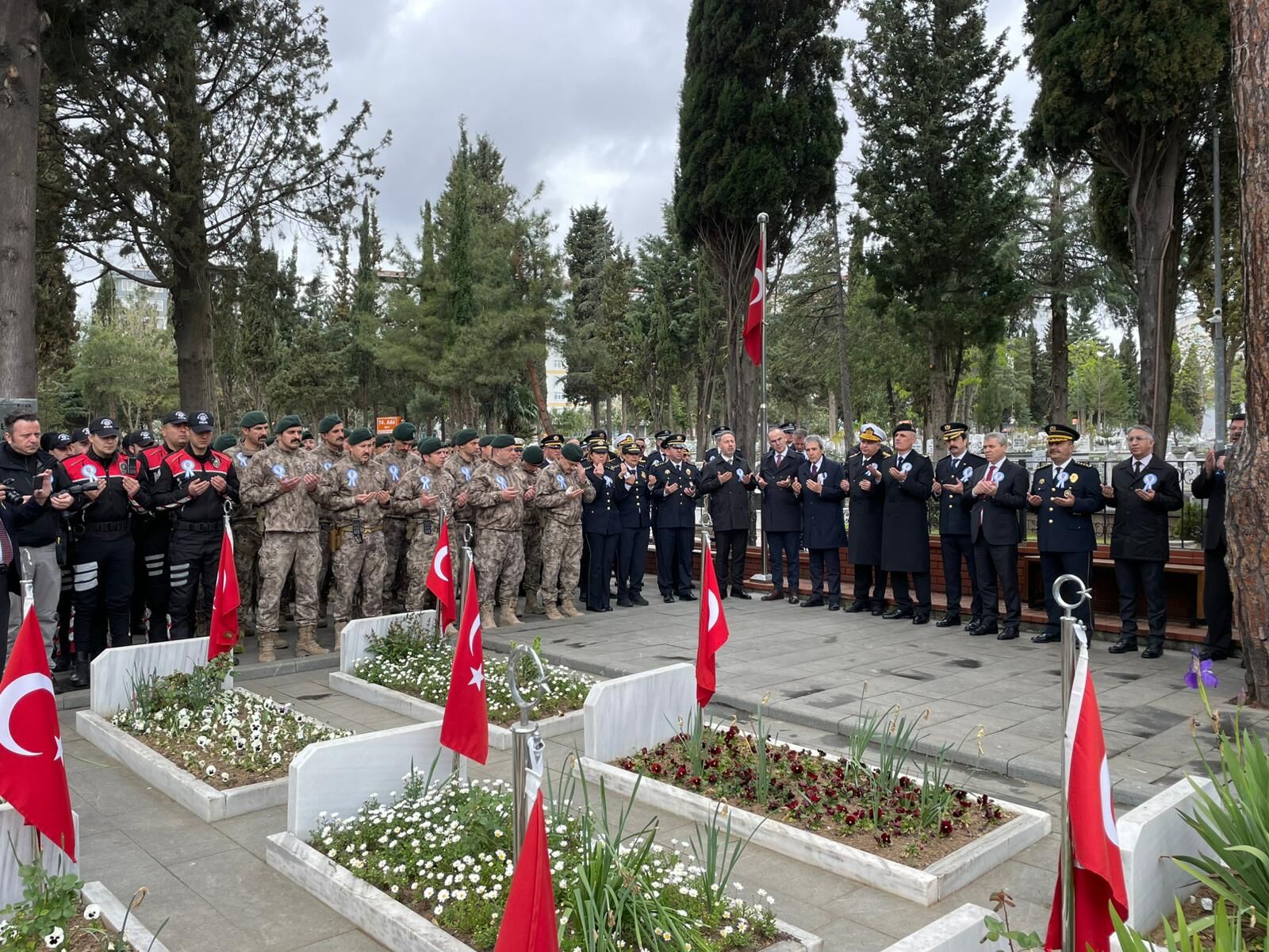 Kıranköy Polis Şehitliği’ndeki programın ardından Asri Mezarlık Şehitliği de ziyaret edildi. Burada şehit kabirleri tek tek ziyaret edilerek dualar edildi ve şehit mezarlarına karanfil bırakıldı.