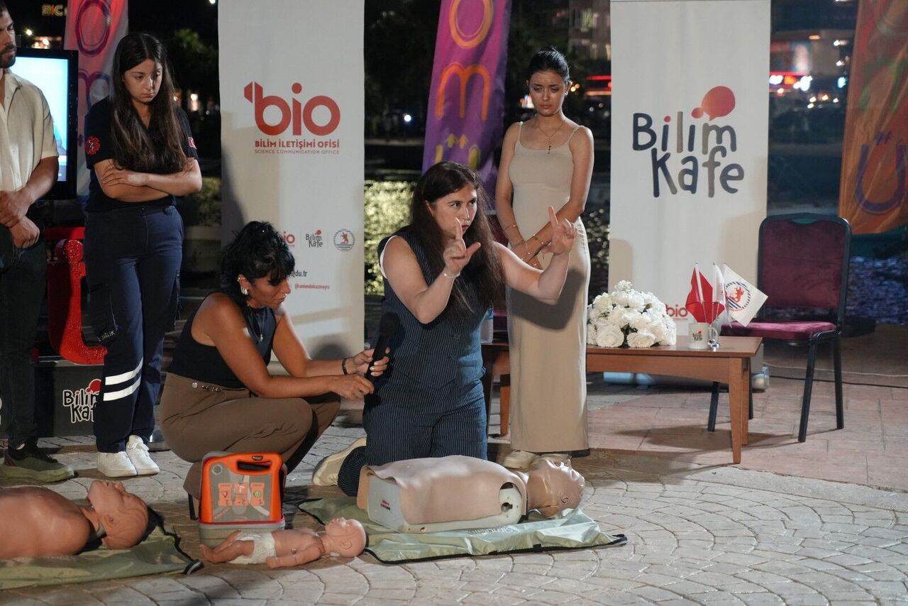 Programda, Öğr. Gör. Dr. Asuman Şener ile Öğr. Gör. Dr. Dilek Kıymaz liderliğinde OMÜ Sağlık Hizmetleri Meslek Yüksekokulu İlk ve Acil Yardım Programı ekibi, ani hastalık veya kaza durumlarında profesyonel sağlık ekibi gelene kadar hayat kurtarmak amacıyla yapılan hızlı ve doğru müdahaleleri katılımcılara uygulamalı olarak gösterdi.