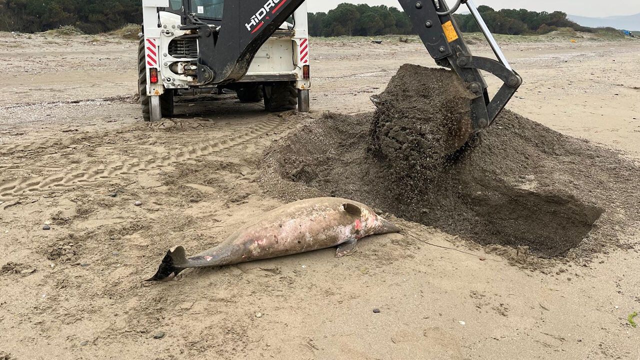 İncelemelerin ardından Alaçam Belediyesi ekipleri, kepçe yardımıyla ölü yunusu sahilde uygun bir alana gömdü.