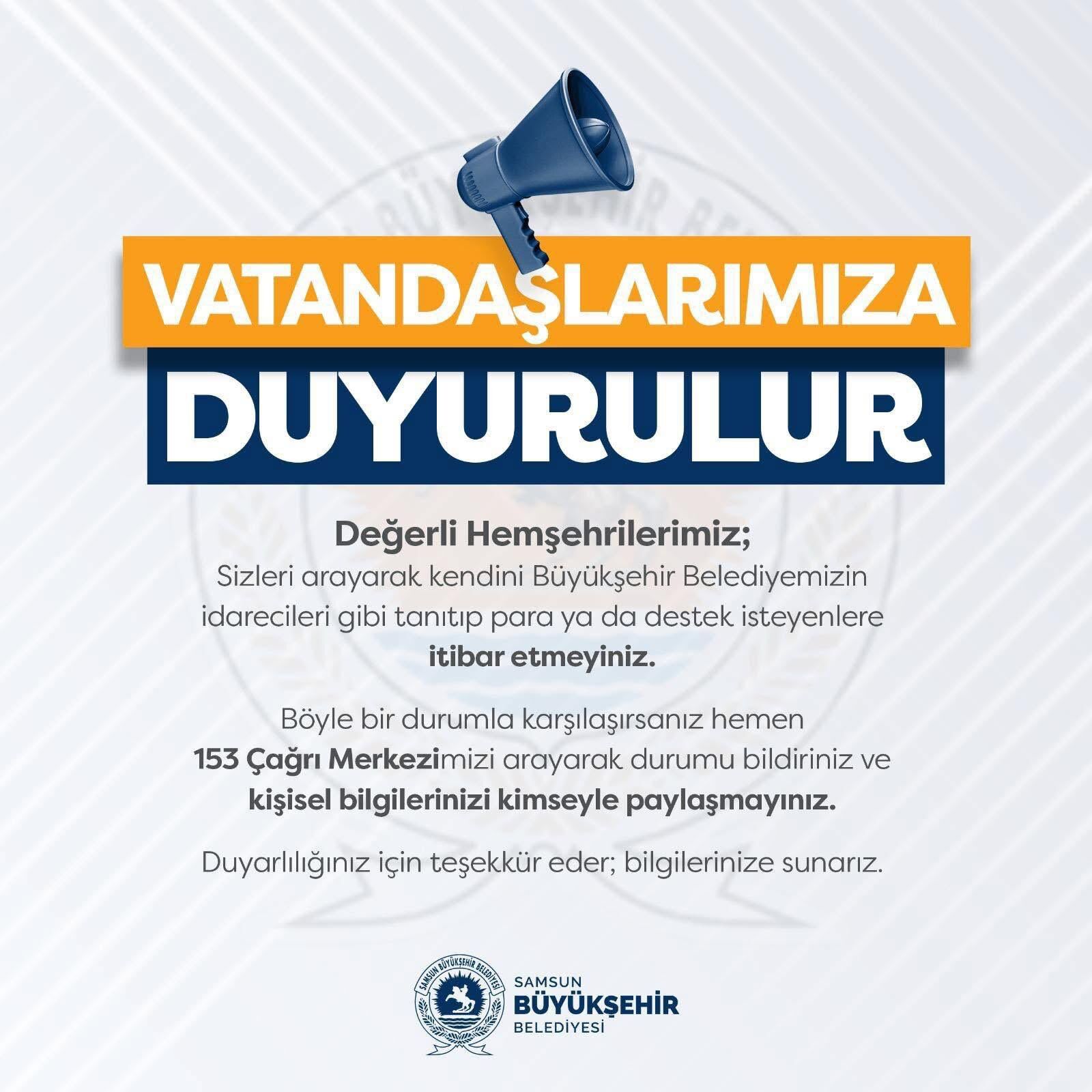 Samsun Büyükşehir Belediyesi, vatandaşları hedef alan dolandırıcılık girişimlerine karşı önemli bir uyarıda bulundu. Belediye adına arama ya da mesaj yoluyla para talep eden kişilere karşı dikkatli olunması istendi.