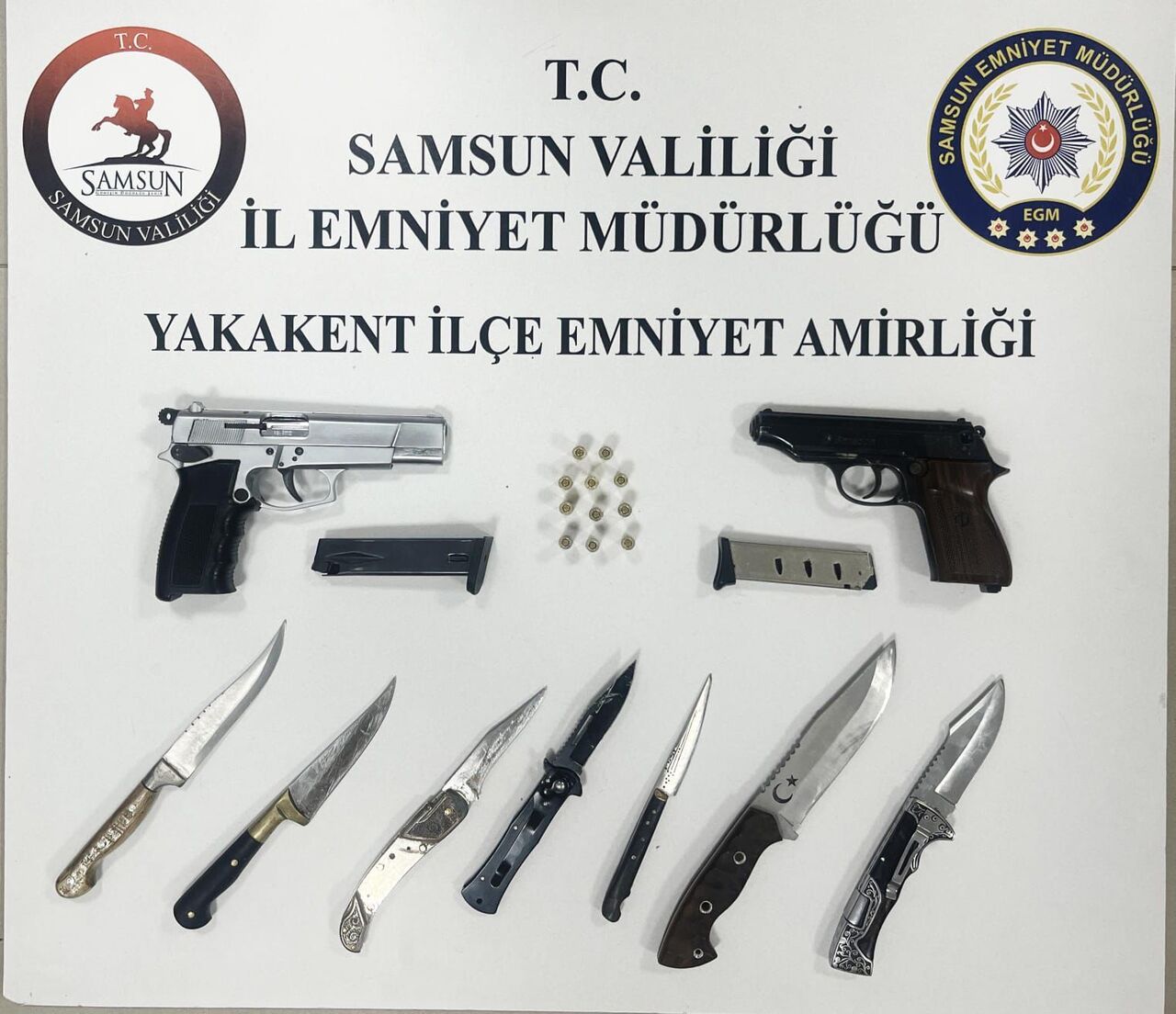 Yapılan aramalarda: 2 adet kurusıkı tabanca, 11 adet kurusıkı tabanca fişeği, 7 adet bıçak ele geçirildi.