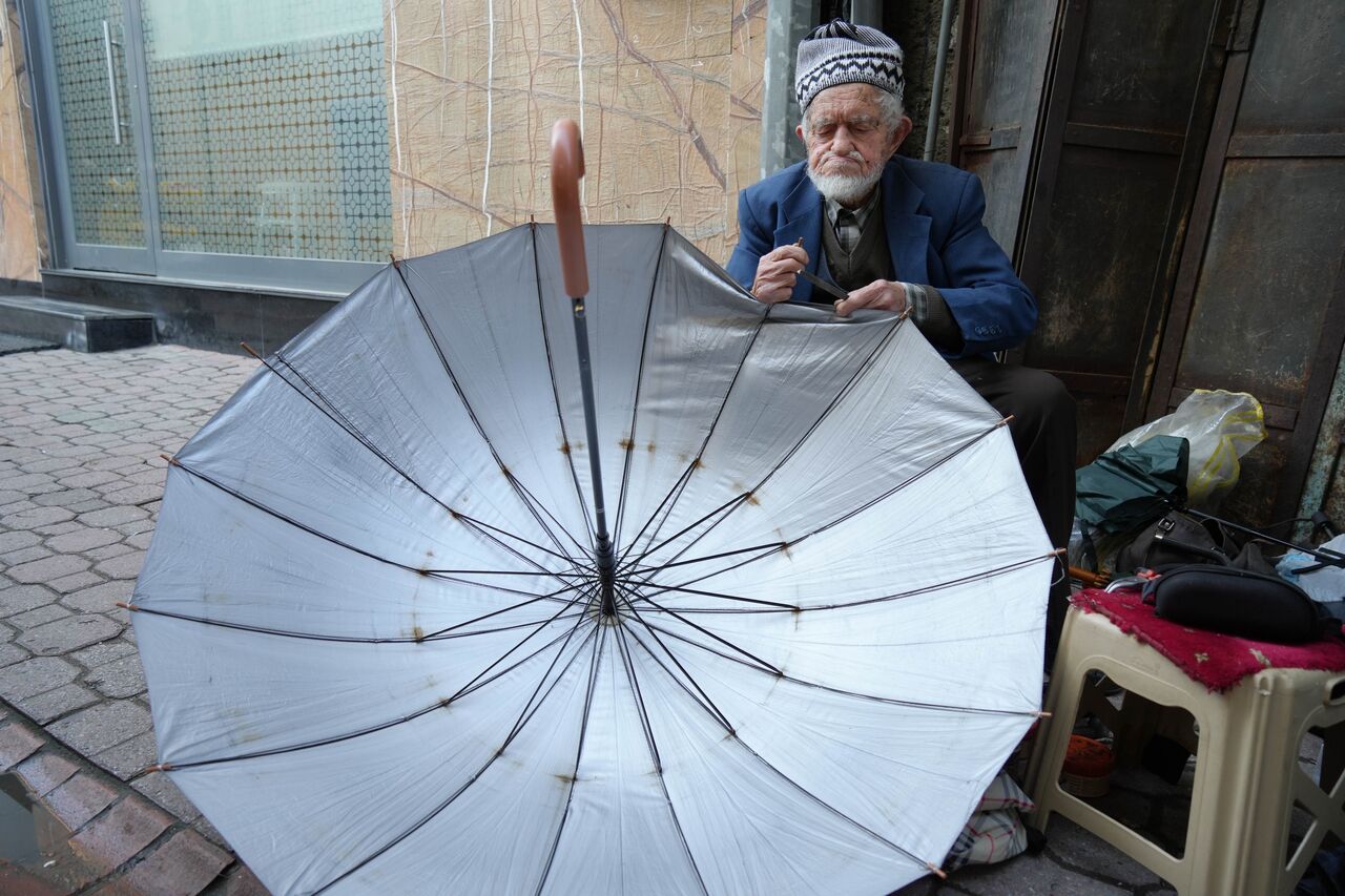 Mesleğinin Samsun’daki son temsilcisi olan 4 çocuk babası Yıldız, yaşıtlarına taş çıkarır bir vaziyette gözlüksüz olarak ipliği iğneye geçirip günde onlarca şemsiye tamir ediyor. Vatandaşlar kendilerine sıra gelmesi için 94 yaşındaki Dursun Yıldız’ın başında sıra bekliyorlar.