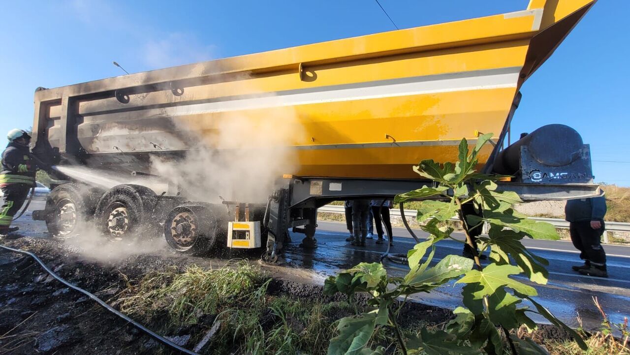 Lastiklerin alev aldığını gören tır sürücüsü, aracı yol kenarına park ederek dorseyi çekiciden ayırdı.