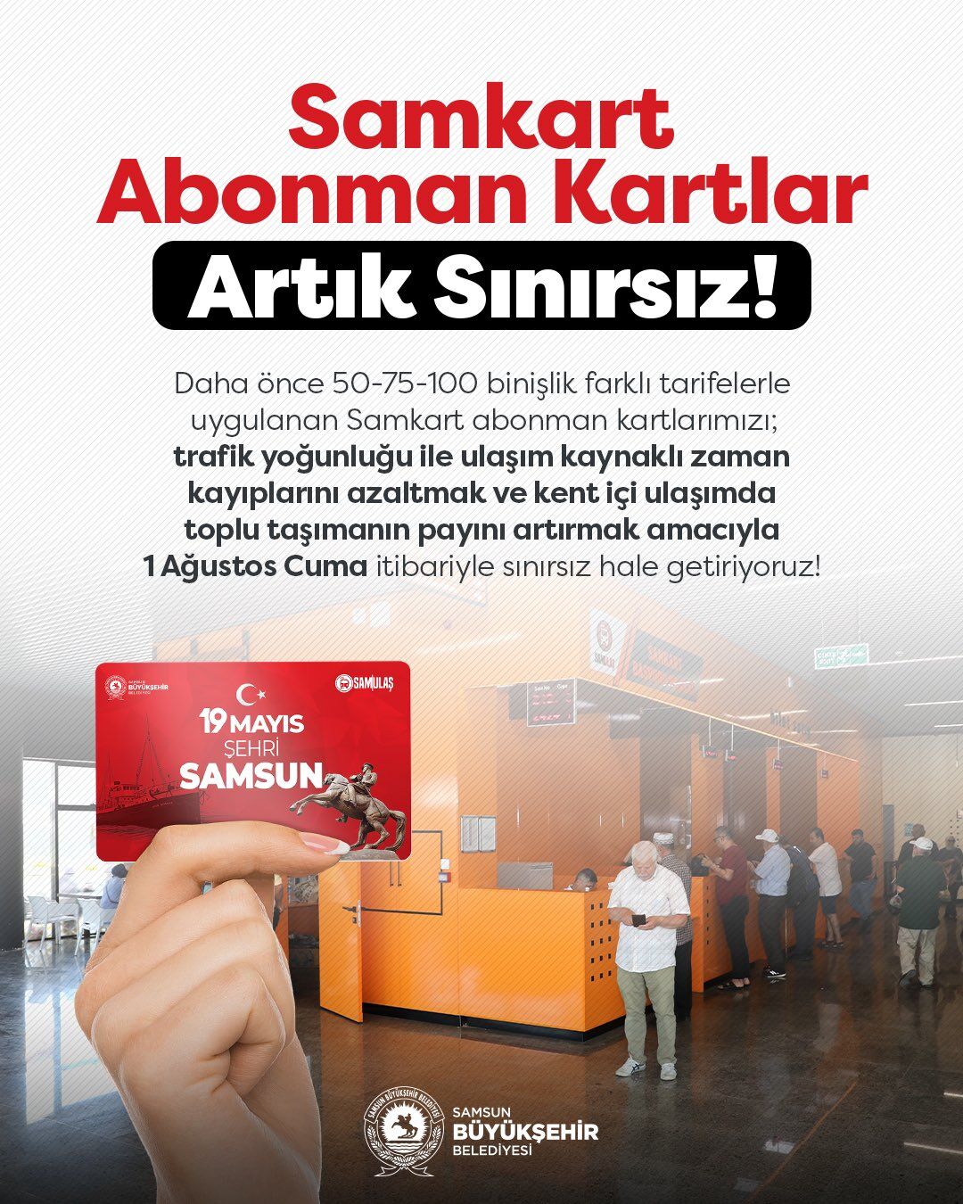 Samsun Büyükşehir Belediyesi, şehir içi ulaşımı kolaylaştıracak önemli bir adım attı. Daha önce 50, 75 ve 100 binişlik tarifelerle sunulan Samkart abonman kartlar, 1 Ağustos Cuma gününden itibaren sınırsız kullanım özelliğiyle yenileniyor.
